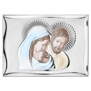 Obrazek srebrny przedstawiający Anioła Stróża, został wykonany z blachy dwuwarstwowej, aluminium i srebra, osadzony na lakierowanym drewnie.