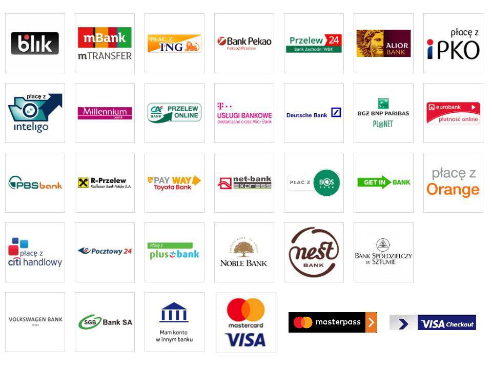 Tradycyjny przelew: forma płatności dla tych klientów, którzy poprzez samodzielne logowanie do swojego banku internetowego, wizytą w banku lub na Poczcie Polskiej opłacą zamówienia. Po złożeniu zamówienia klient otrzymuje drogą mailową numer konta bankowego wraz z niezbędnymi danym, na który należy przelać właściwą kwotę. W momencie zaksięgowania przelewu na naszym koncie rozpoczynamy procedurę zamówienia.