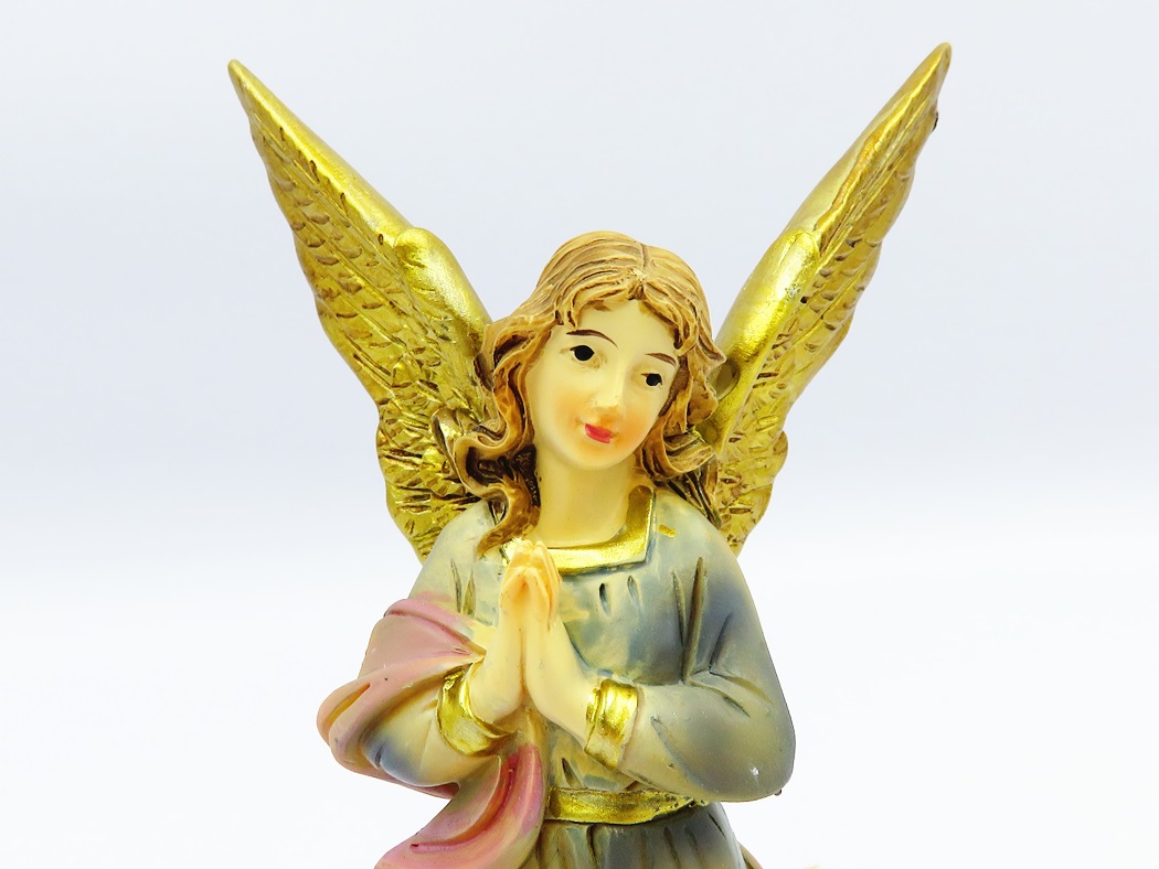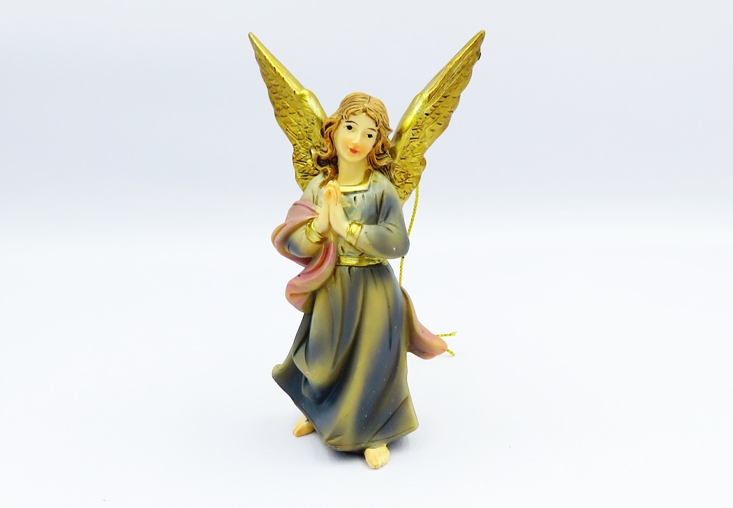 Figurka Anioła, ręcznie szlifowana i malowana wysokiej jakości farbami, wykonana z masy żywicznej utwardzanej  – tworzywo odporne na warunki atmosferyczne i czynniki zewnętrzne.