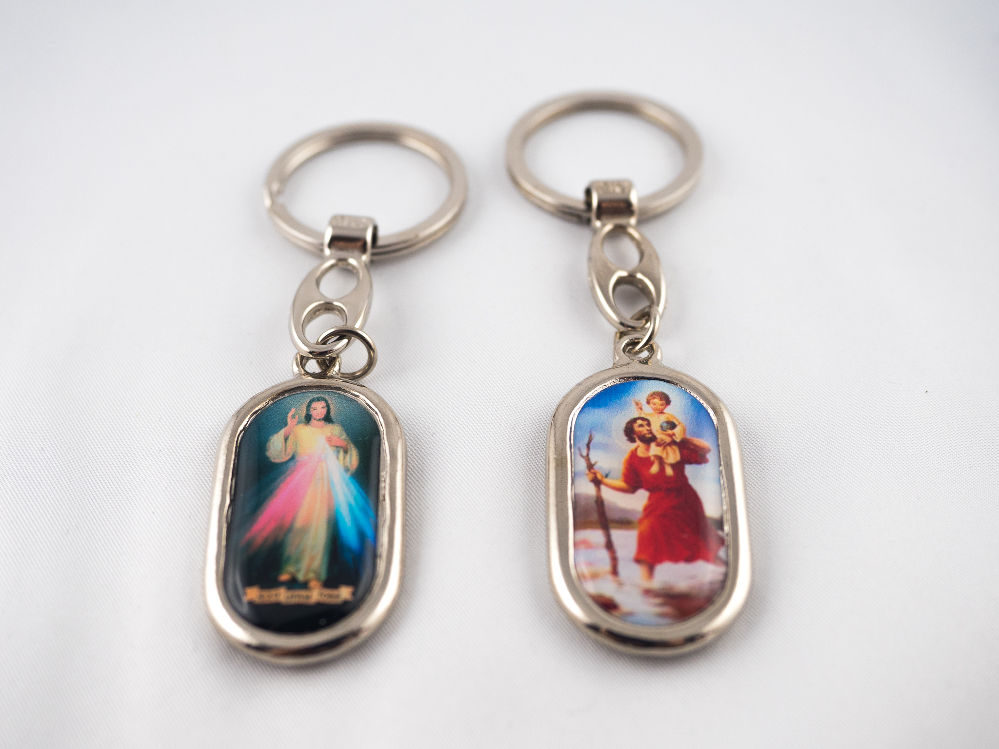 Brelok metalowy dwustronny (Jezu Ufam Tobie i Św. Krzysztof)