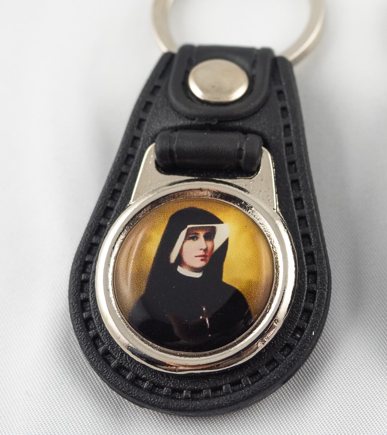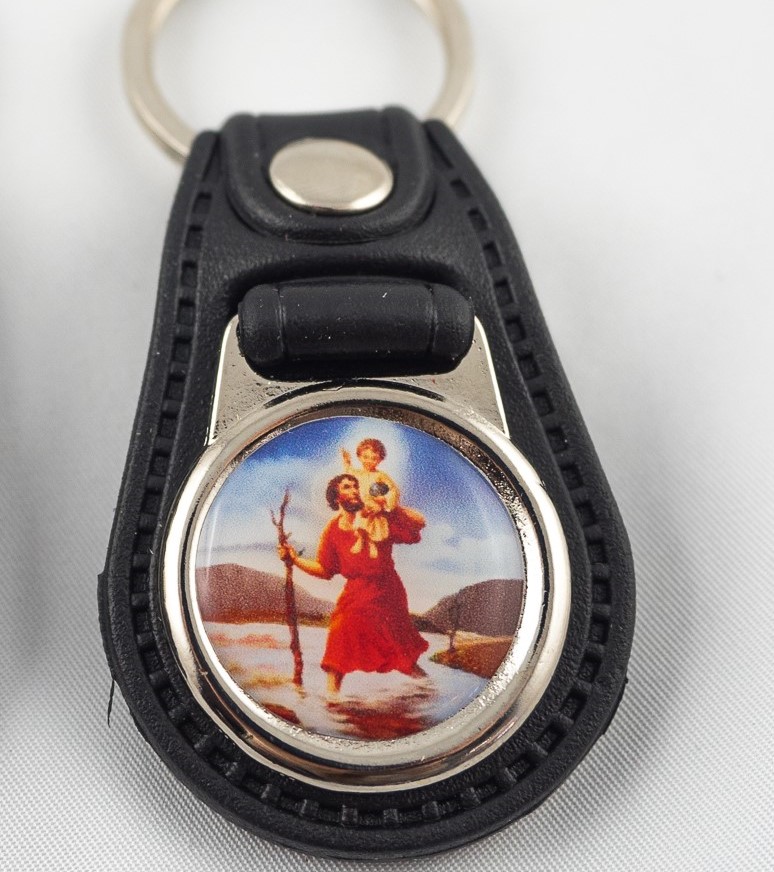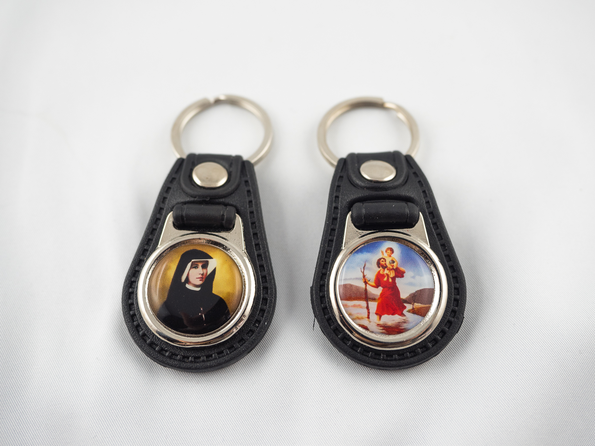 Brelok skóropodobny z wizerunkiem św. Siostry Faustyny lub św. Krzysztofa, jednostronny.