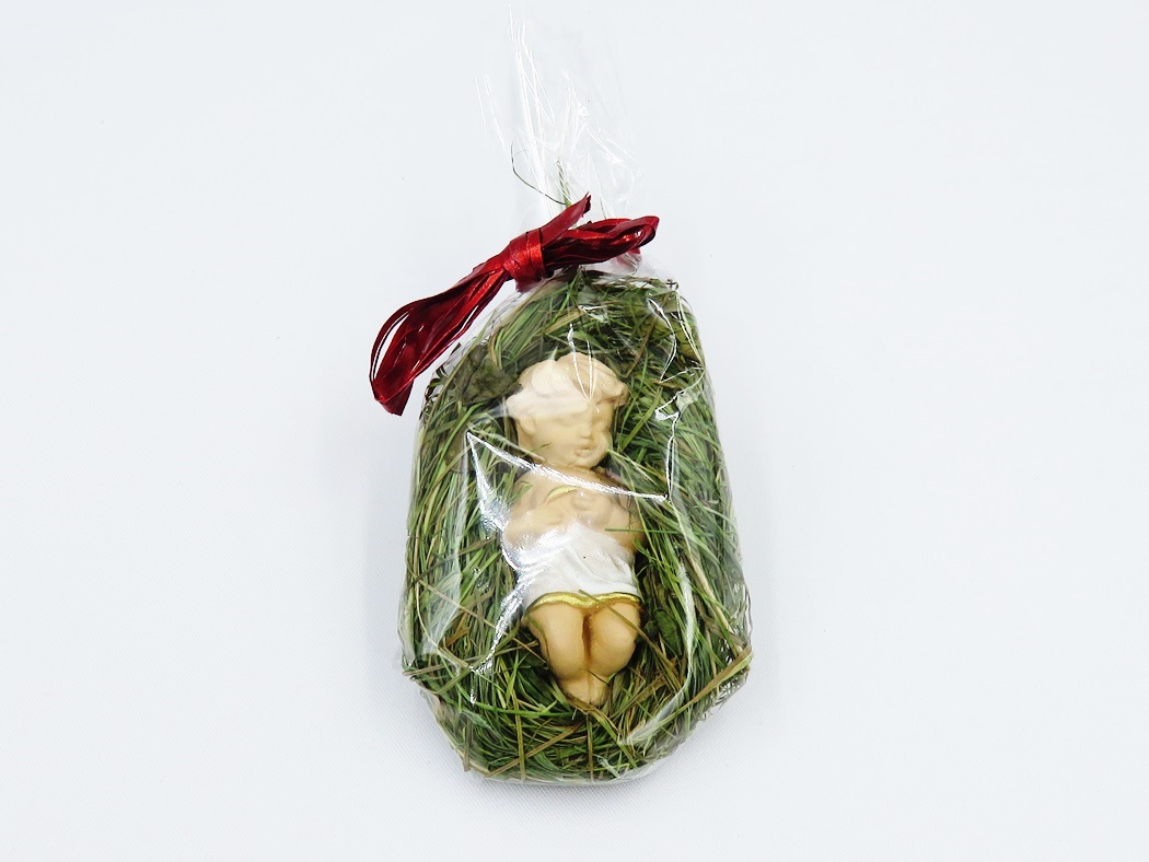 Figurka Dzieciątka Jezus na sianku. Figurka z masy gipsowej, malowana.