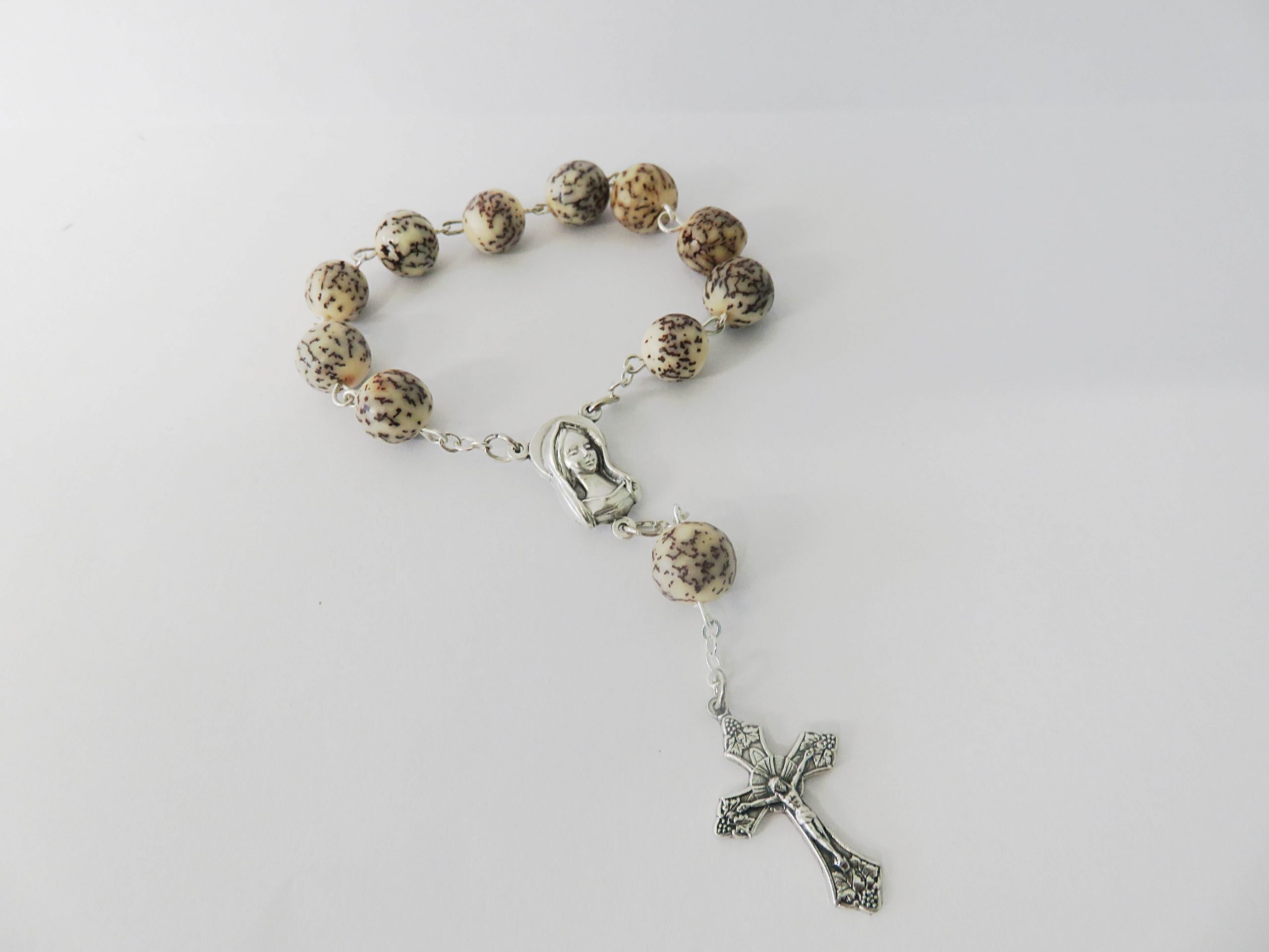 Dziesiątka różańca, którego paciorki zostały wykonane z lekkiego i trwałego materiału – drzewa kokosowego.