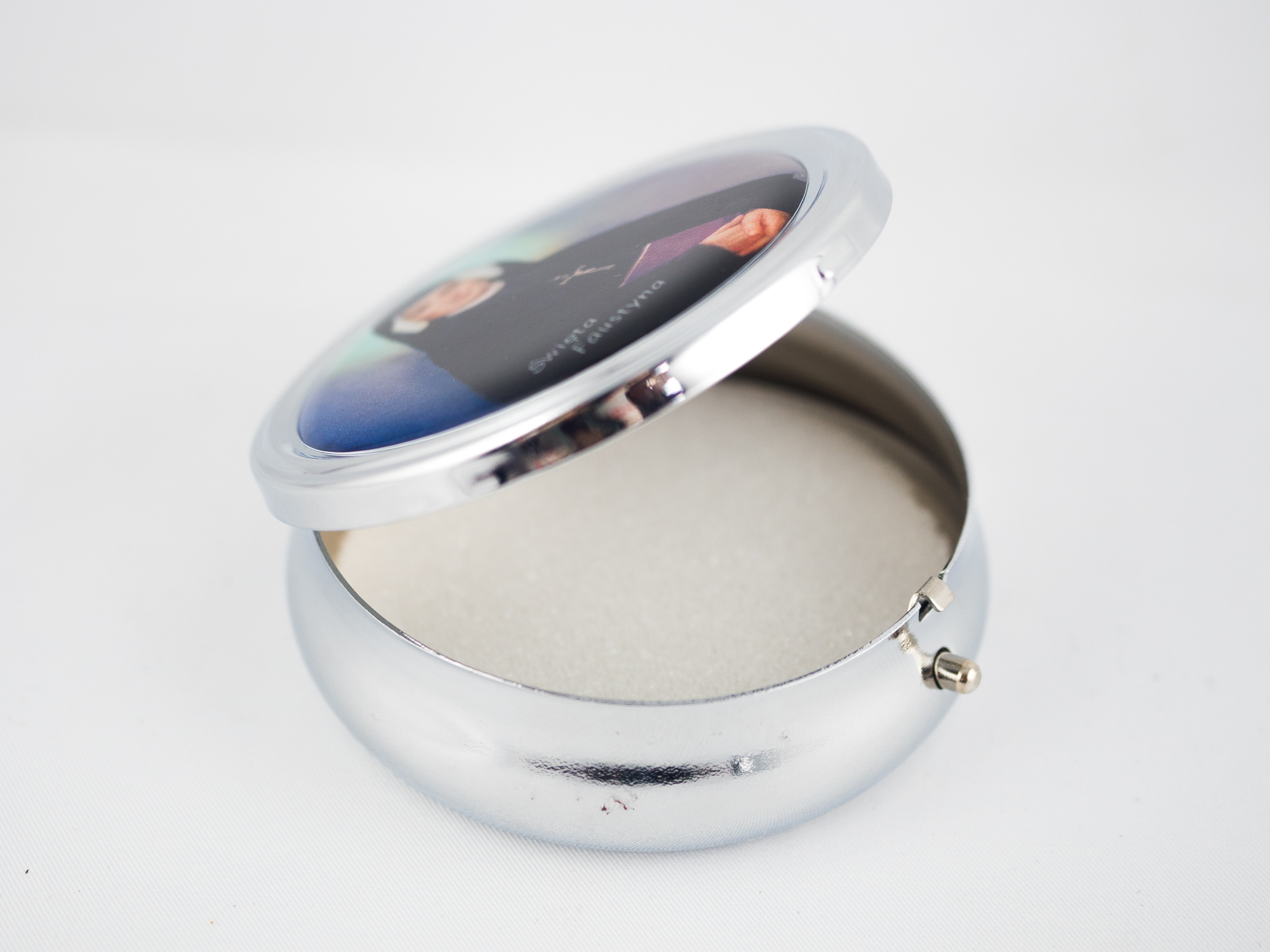 Pudełko metalowe na różaniec z wizerunkiem św. Siostry Faustyny lub Pana Jezusa Miłosiernego.