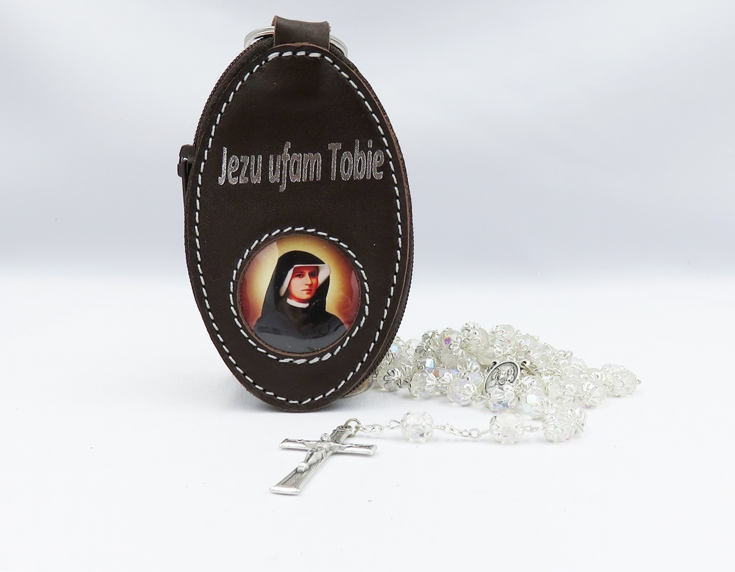 Skórzane etui na różaniec zapinane na zamek z wizerunkiem św. Siostry Faustyny.