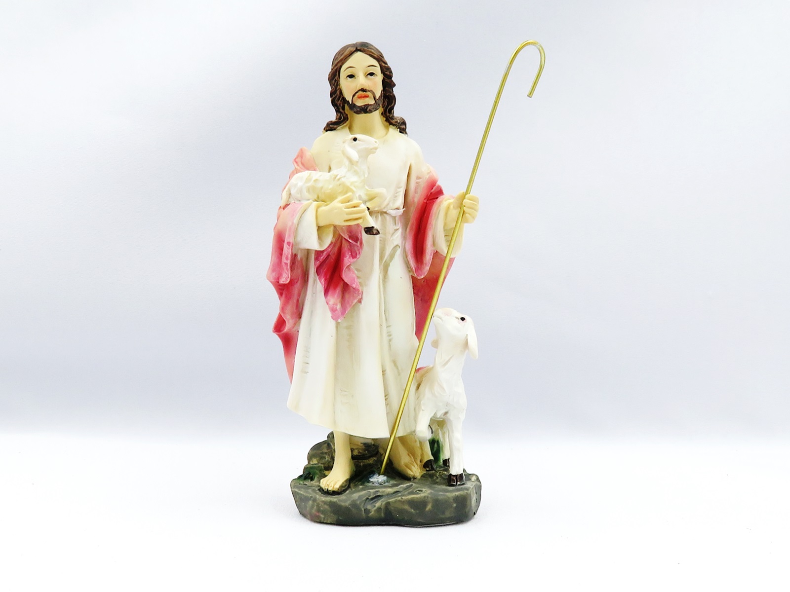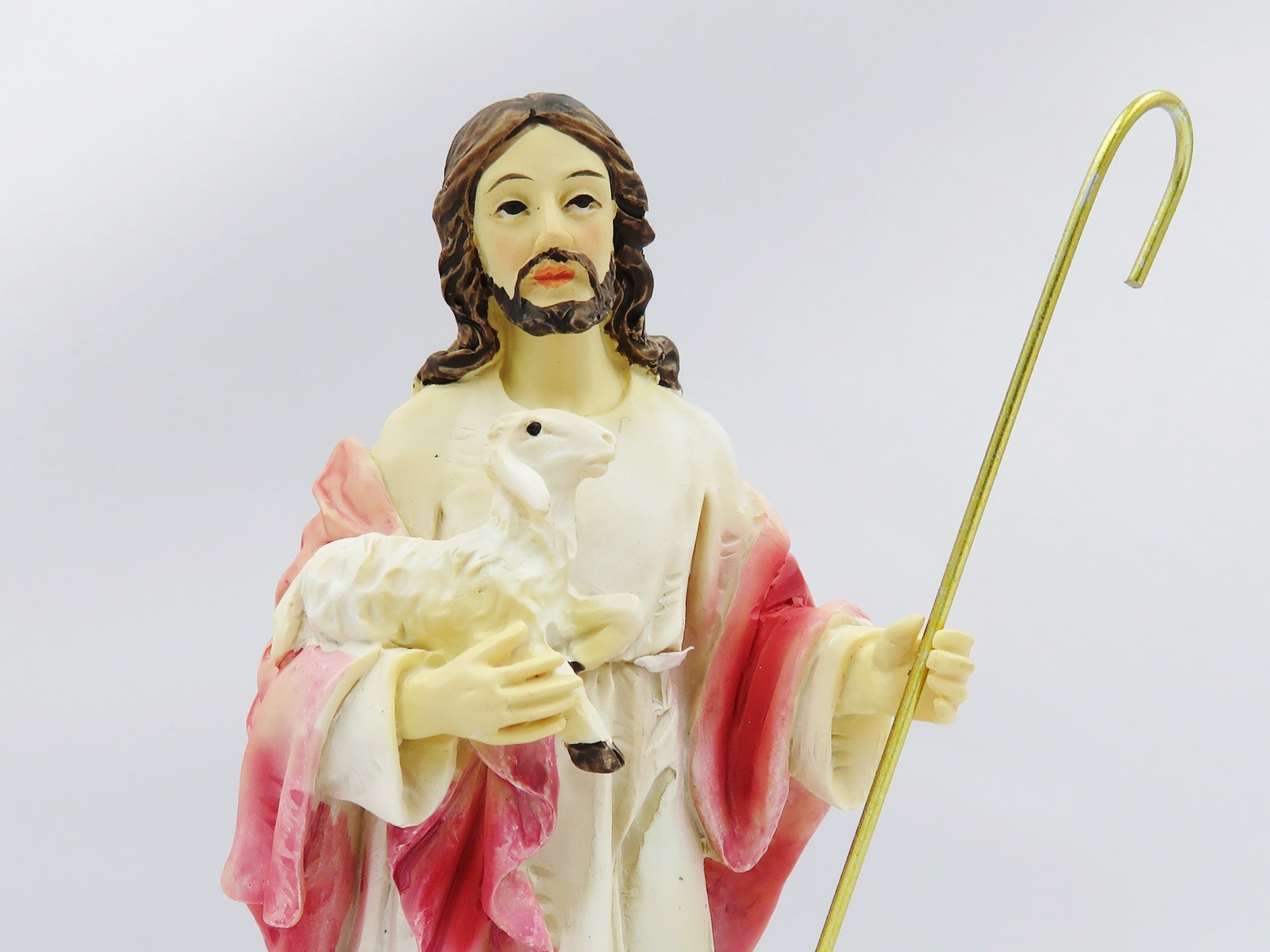 Figurka przedstawiająca Dobrego Pasterza, ręcznie szlifowana i malowana wysokiej jakości farbami, wykonana z masy żywicznej utwardzanej  – tworzywo odporne na warunki atmosferyczne i czynniki zewnętrzne.