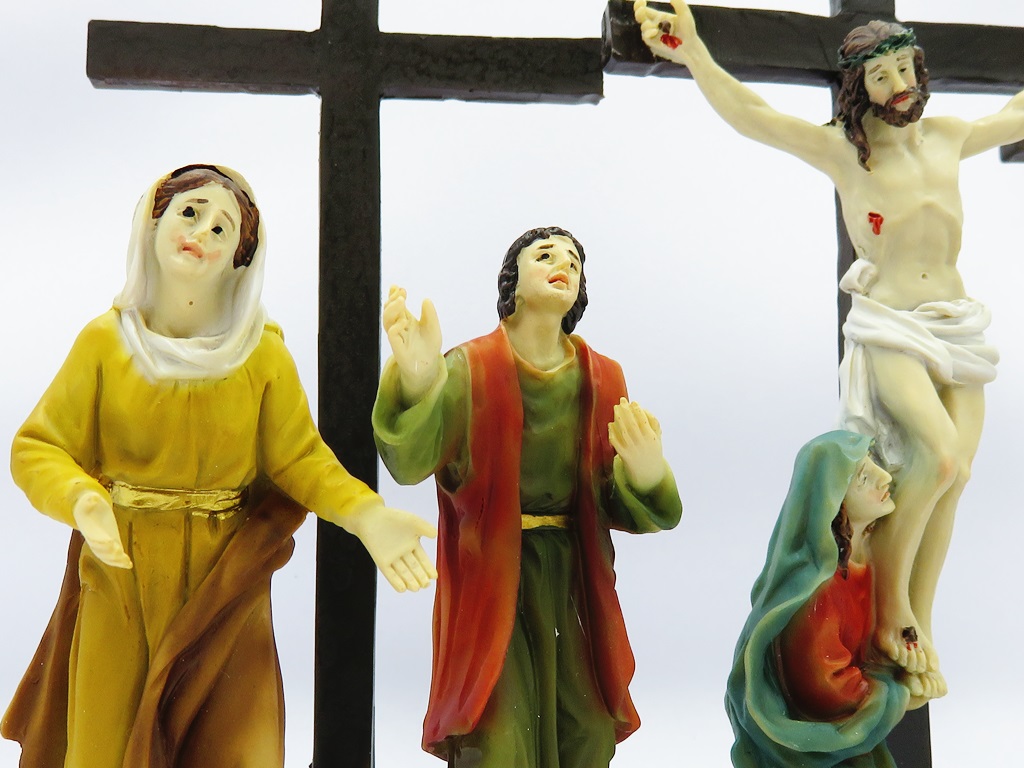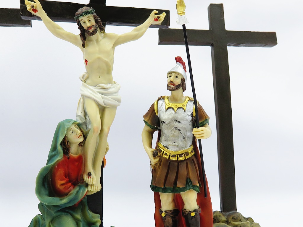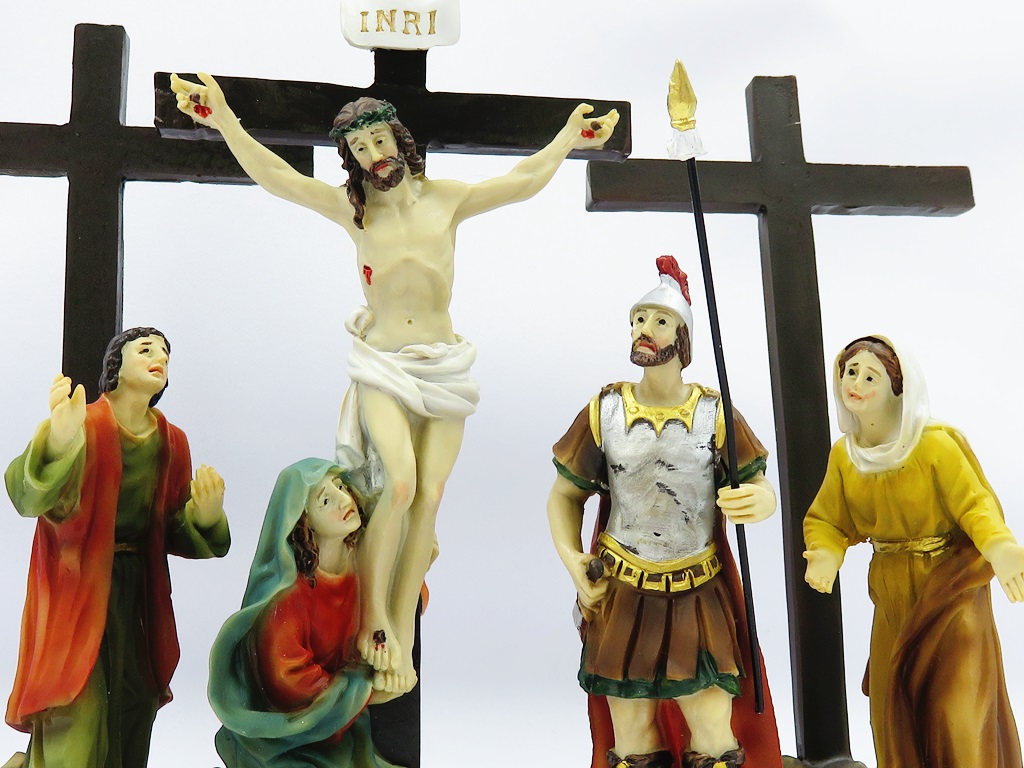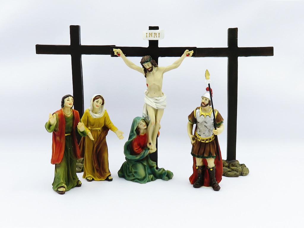 Figurki przedstawiające Ukrzyżowanie Pana Jezusa, ręcznie szlifowane i malowane wysokiej jakości farbami, wykonane z masy żywicznej utwardzanej – tworzywo odporne na warunki atmosferyczne i czynniki zewnętrzne.