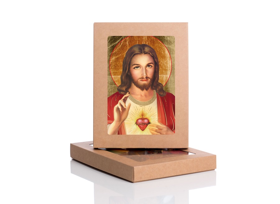 Ikona Pana Jezusa z jego Najświętszym Sercem, wykonana unikalną technologią nanoszenia obrazu na drewno, która pozwala na wierne odtworzenie oryginału. Ikona została wykonana na desce olchowej, litej, klejonej dzięki czemu jest odporna na pęknięcia i wygięcie. Złocenia na ikonie wykonane ręcznie, złotem płatkowym.