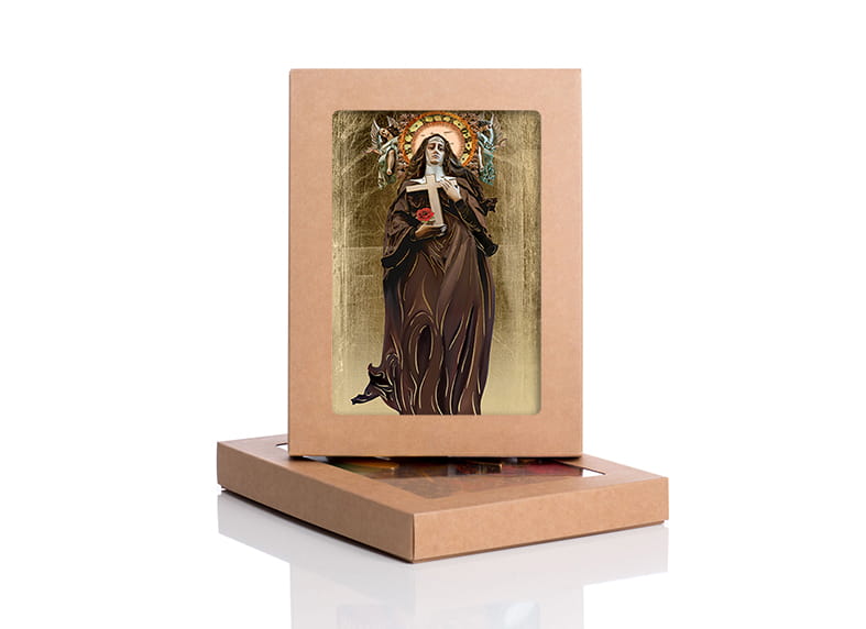 Ikona świętej Rity, wykonana unikalną technologią nanoszenia obrazu na drewno, która pozwala na wierne odtworzenie oryginału. Ikona została wykonana na desce olchowej, litej, klejonej dzięki czemu jest odporna na pęknięcia i wygięcie. Złocenia na ikonie wykonane ręcznie, złotem płatkowym.
