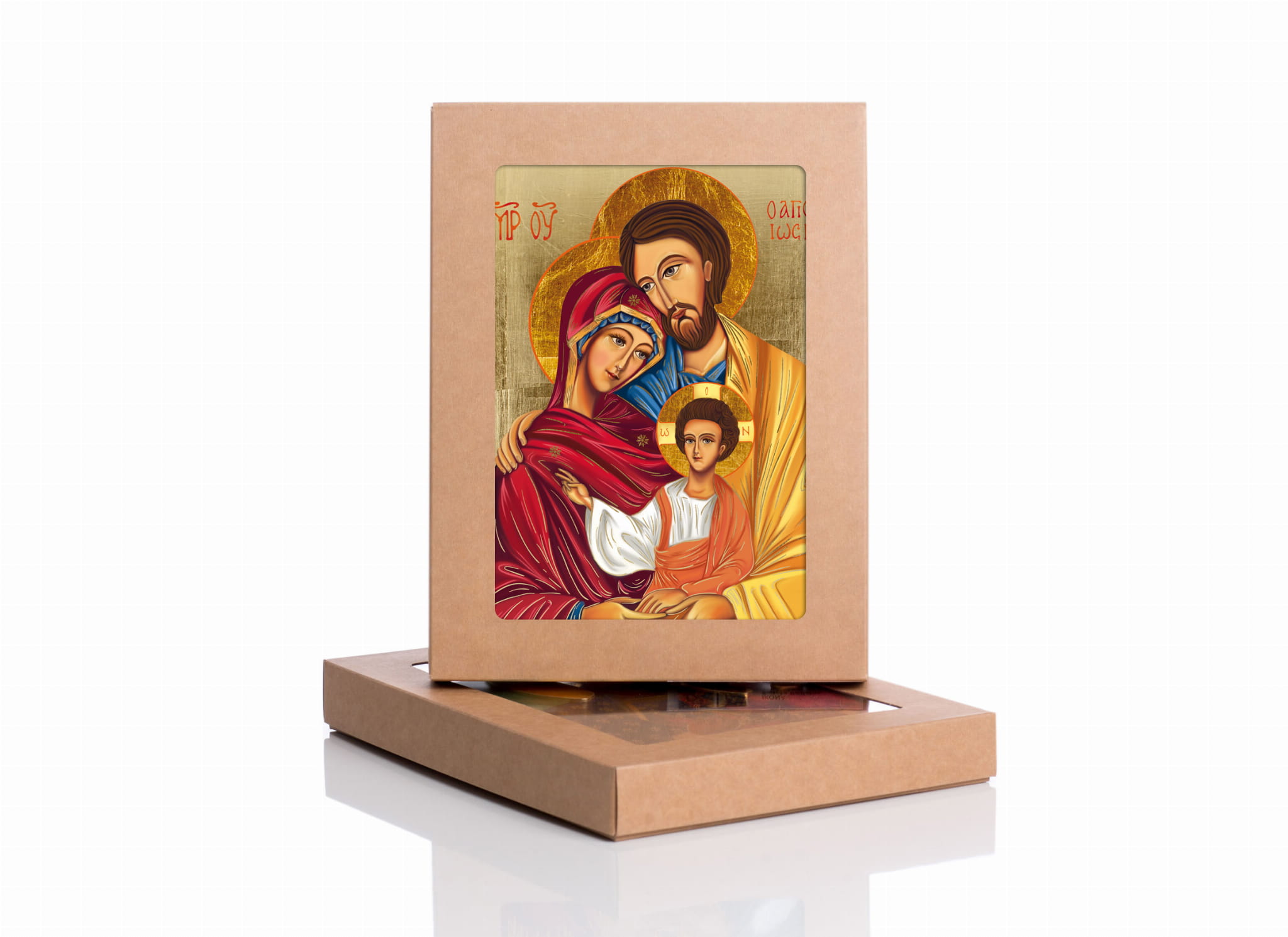 Ikona Świętej Rodziny wykonana unikalną technologią nanoszenia obrazu na drewno, która pozwala na wierne odtworzenie oryginału. Ikona została wykonana na desce olchowej, litej, klejonej dzięki czemu jest odporna na pęknięcia i wygięcie. Złocenia na ikonie wykonane ręcznie, złotem płatkowym.