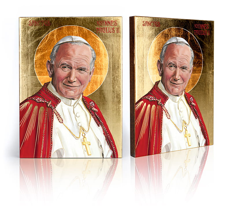 Ikona świętego Jana Pawła II, wykonana unikalną technologią nanoszenia obrazu na drewno, która pozwala na wierne odtworzenie oryginału. Ikona została wykonana na desce olchowej, litej, klejonej dzięki czemu jest odporna na pęknięcia i wygięcie. Złocenia na ikonie wykonane ręcznie, złotem płatkowym.