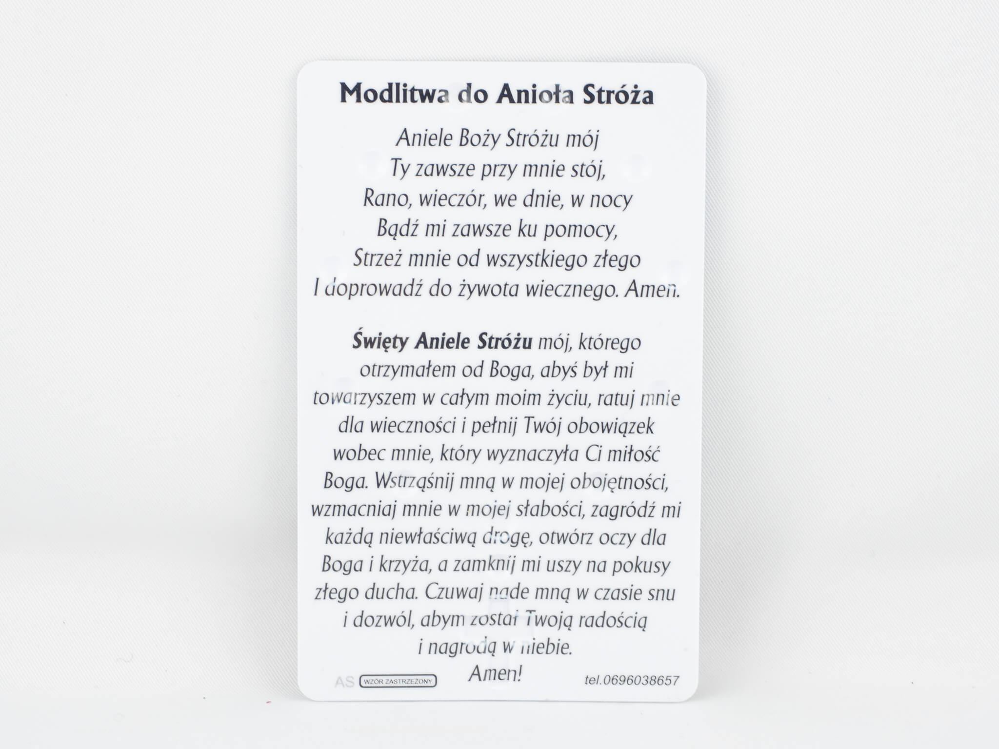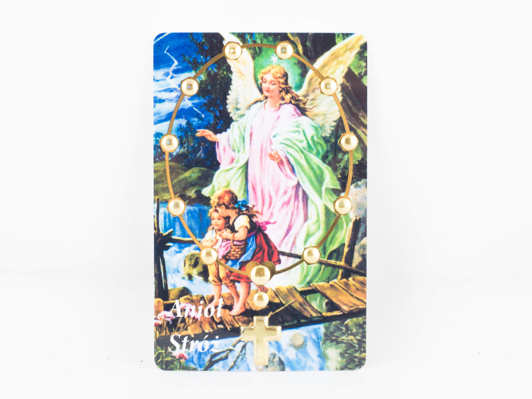 Karta plastikowa z dziesiątką różańca ze złotych paciorków imitowanych przez wypukłe wytłoczenia.  Na rewersie znajdują się modlitwy do Anioła Stróża.