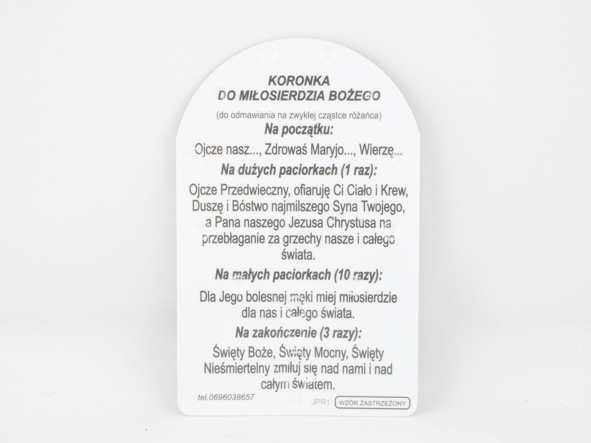 Karta plastikowa z dziesiątką różańca ze złotych paciorków imitowanych przez wypukłe wytłoczenia.  Na rewersie znajduje się Koronka do Miłosierdzia Bożego.