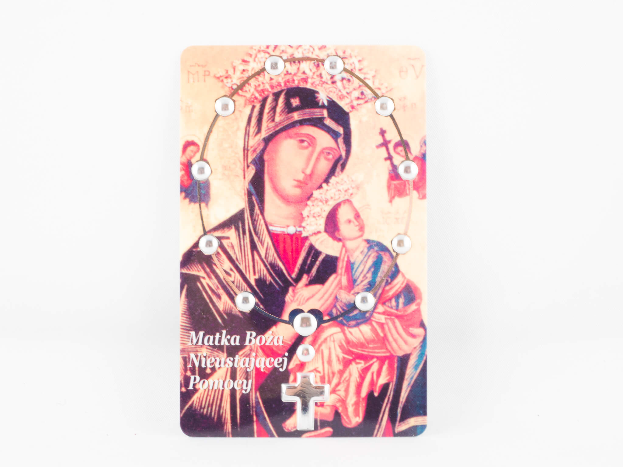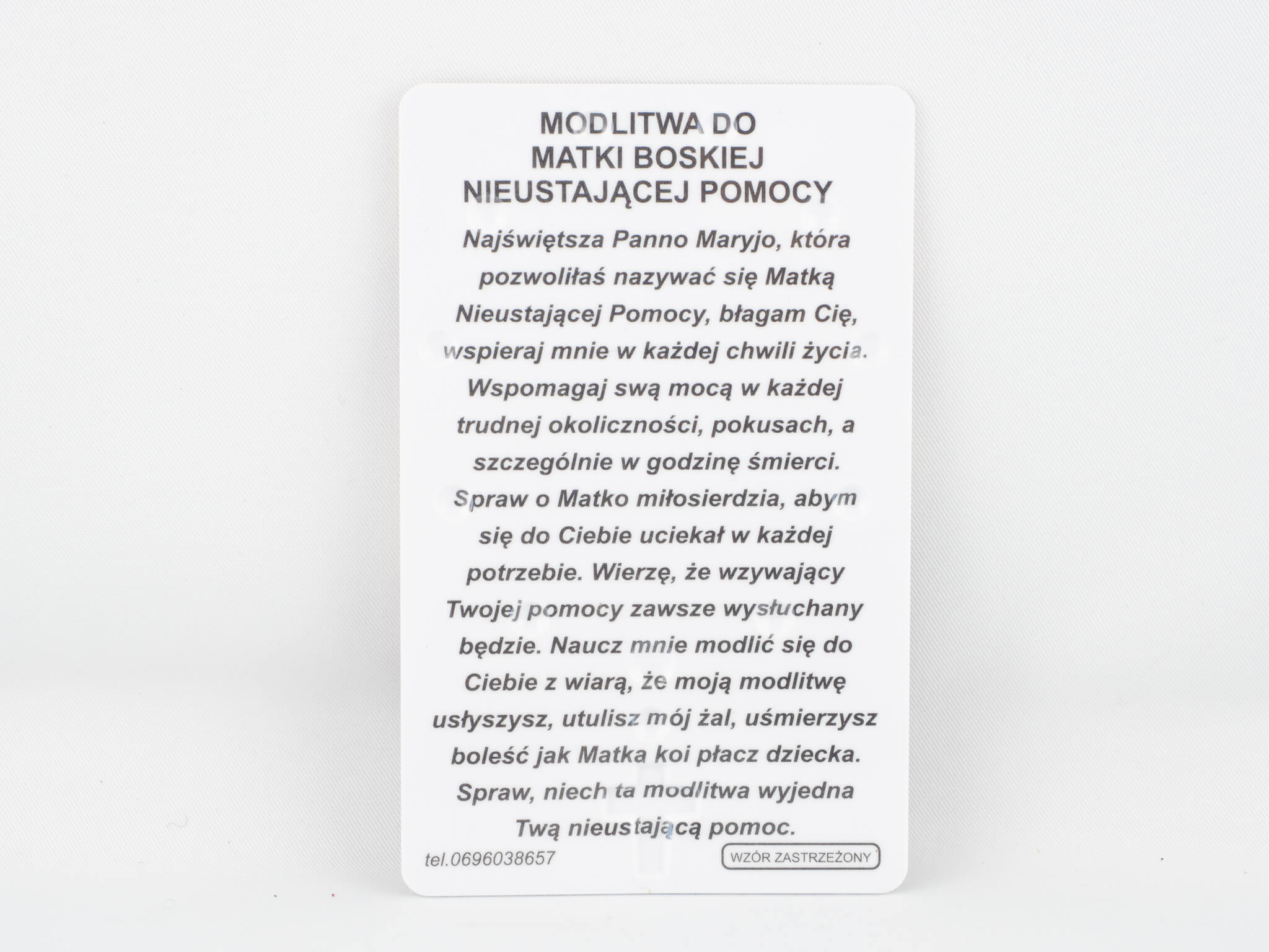 Karta plastikowa z dziesiątką różańca ze złotych paciorków imitowanych przez wypukłe wytłoczenia. Na rewersie znajduje się modlitwa do Matki Bożej Nieustającej Pomocy.