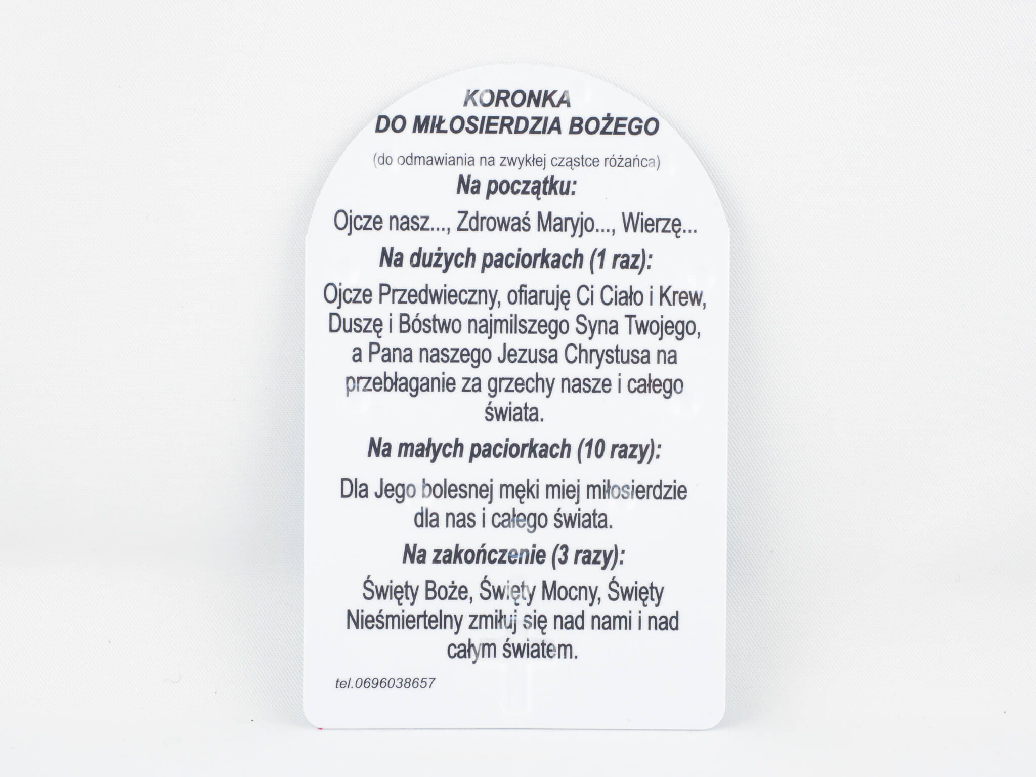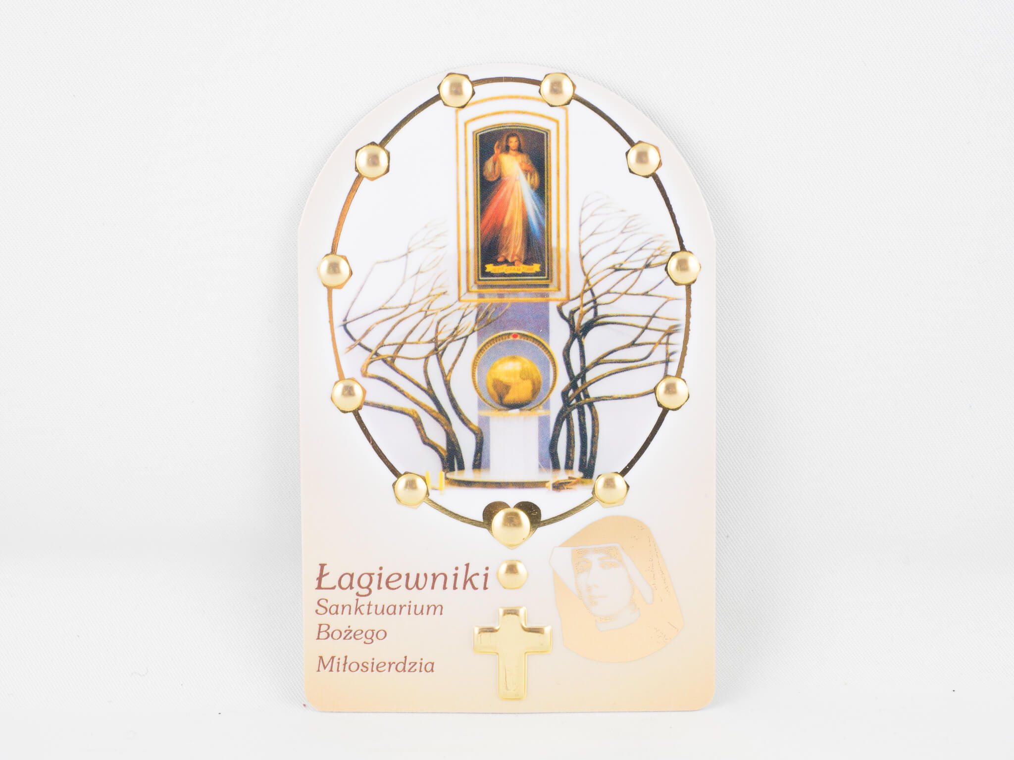 Karta plastikowa z dziesiątką różańca ze złotych paciorków imitowanych przez wypukłe wytłoczenia.  Na rewersie znajduje się Koronka do Miłosierdzia Bożego.