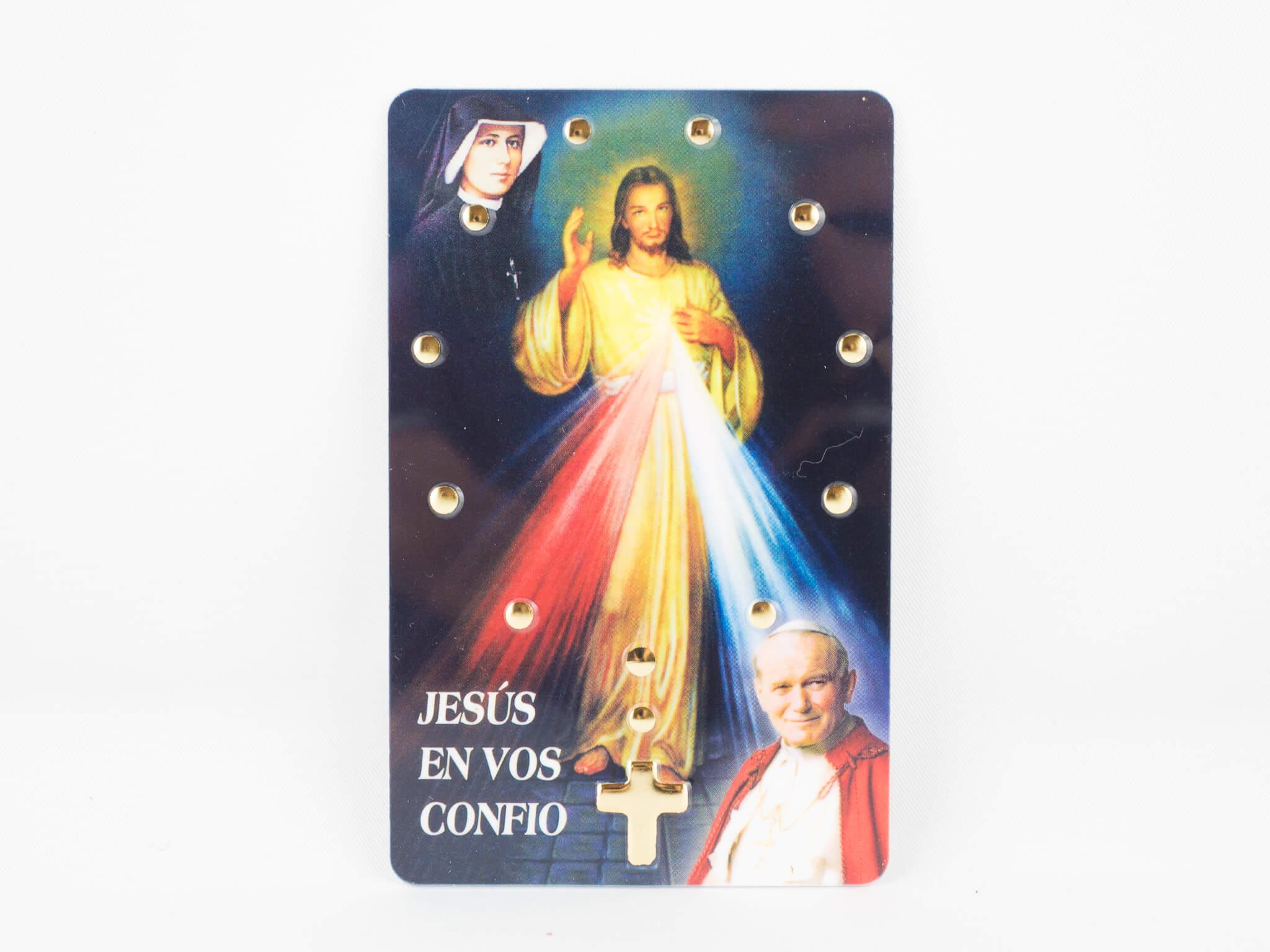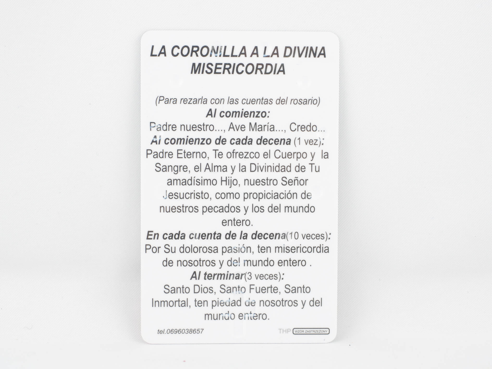 Karta plastikowa z dziesiątką różańca ze złotych paciorków imitowanych przez wypukłe wytłoczenia. Na rewersie znajduje się Koronka do Miłosierdzia Bożego w języku hiszpańskim.