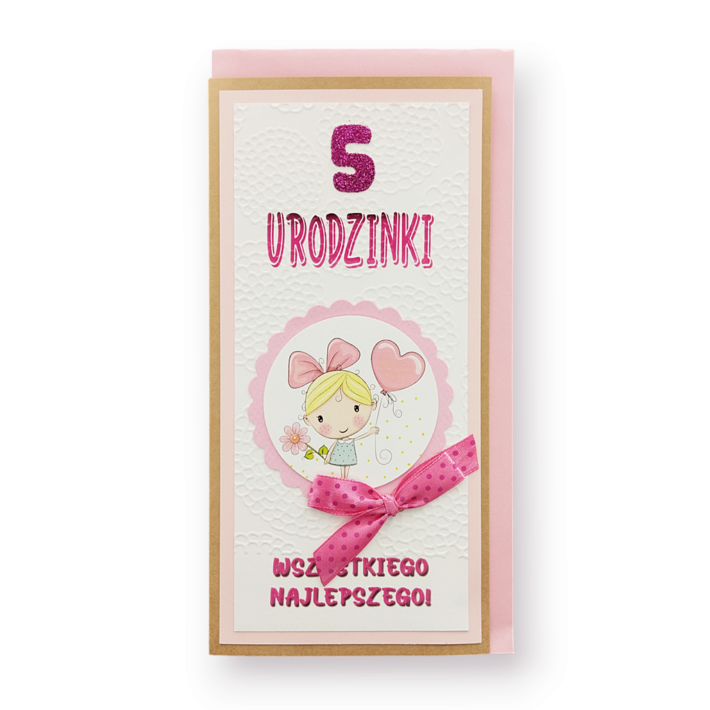 Ręcznie wykonana kartka z życzeniami na piąte urodziny dla dziewczynki.