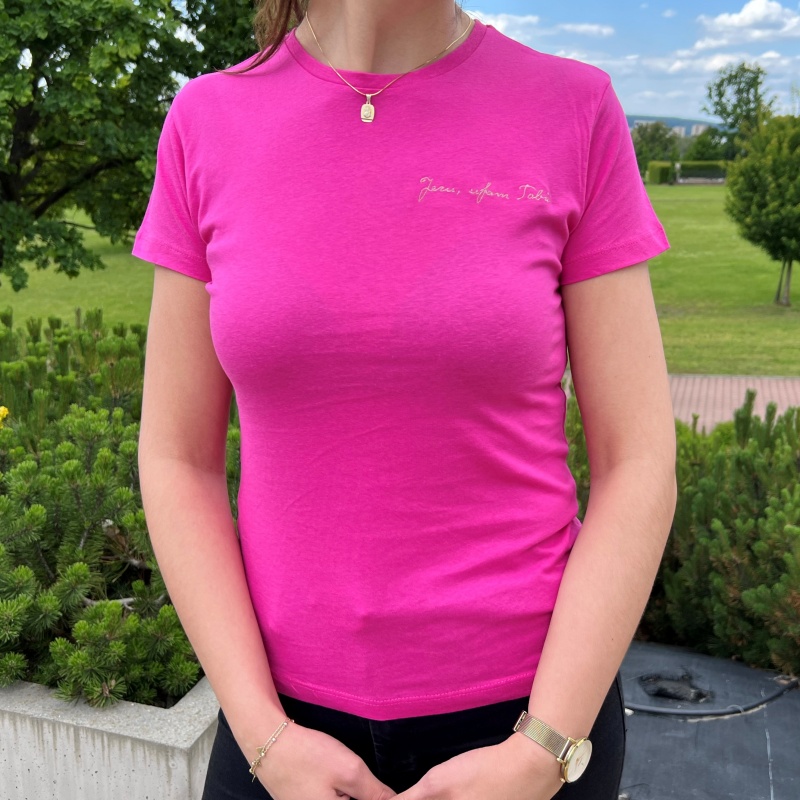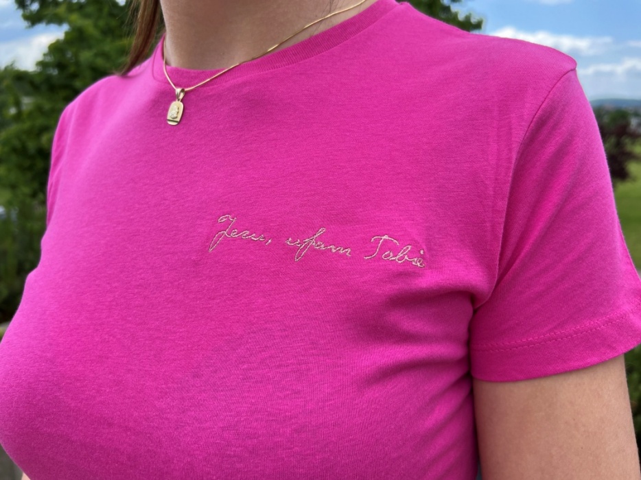 Damska koszulka bawełniana z haftem w kolorze fuksji.