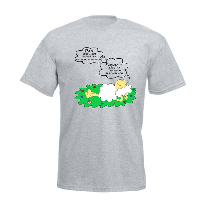 Koszulka bawełniana z nadrukiem „Pan jest moim Pasterzem, nie brak mi niczego. Pozwala mi leżeć na zielonych pastwiskach.” – kolor szary.