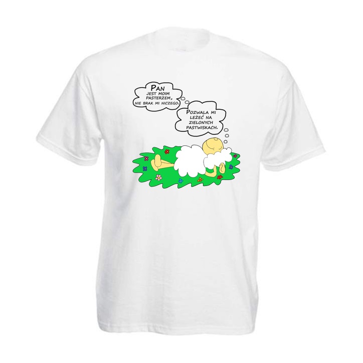 Koszulka bawełniana z nadrukiem „Pan jest moim Pasterzem, nie brak mi niczego. Pozwala mi leżeć na zielonych pastwiskach.” – kolor biały.