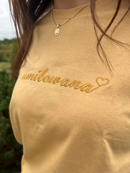 Koszulka bawełniana z haftem w piaskowym kolorze.