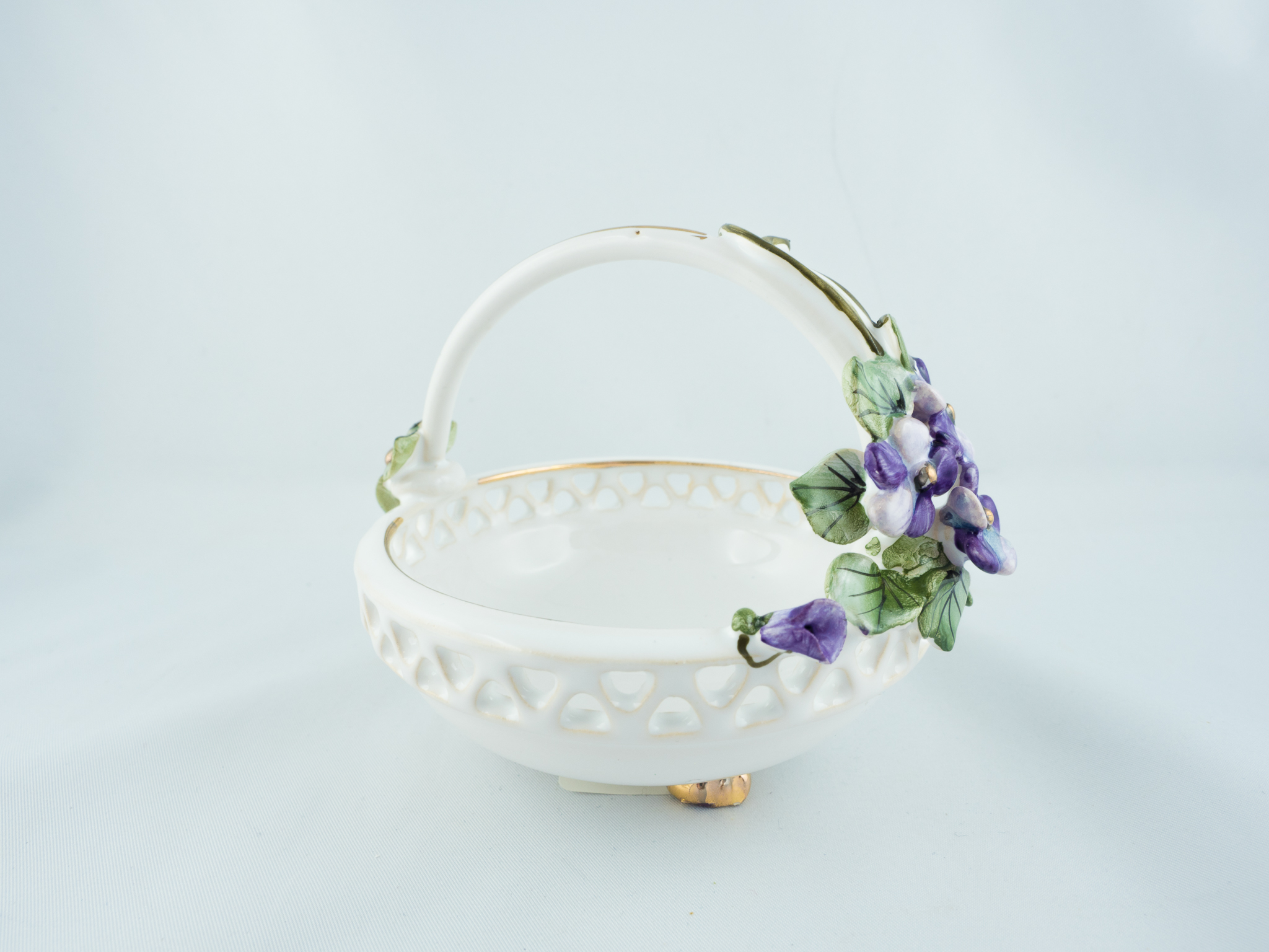 Ceramiczny koszyczek z fiołkami. Złocony, malowany ręcznie farbami najwyższej jakości, wypalany w bardzo wysokich temperaturach.