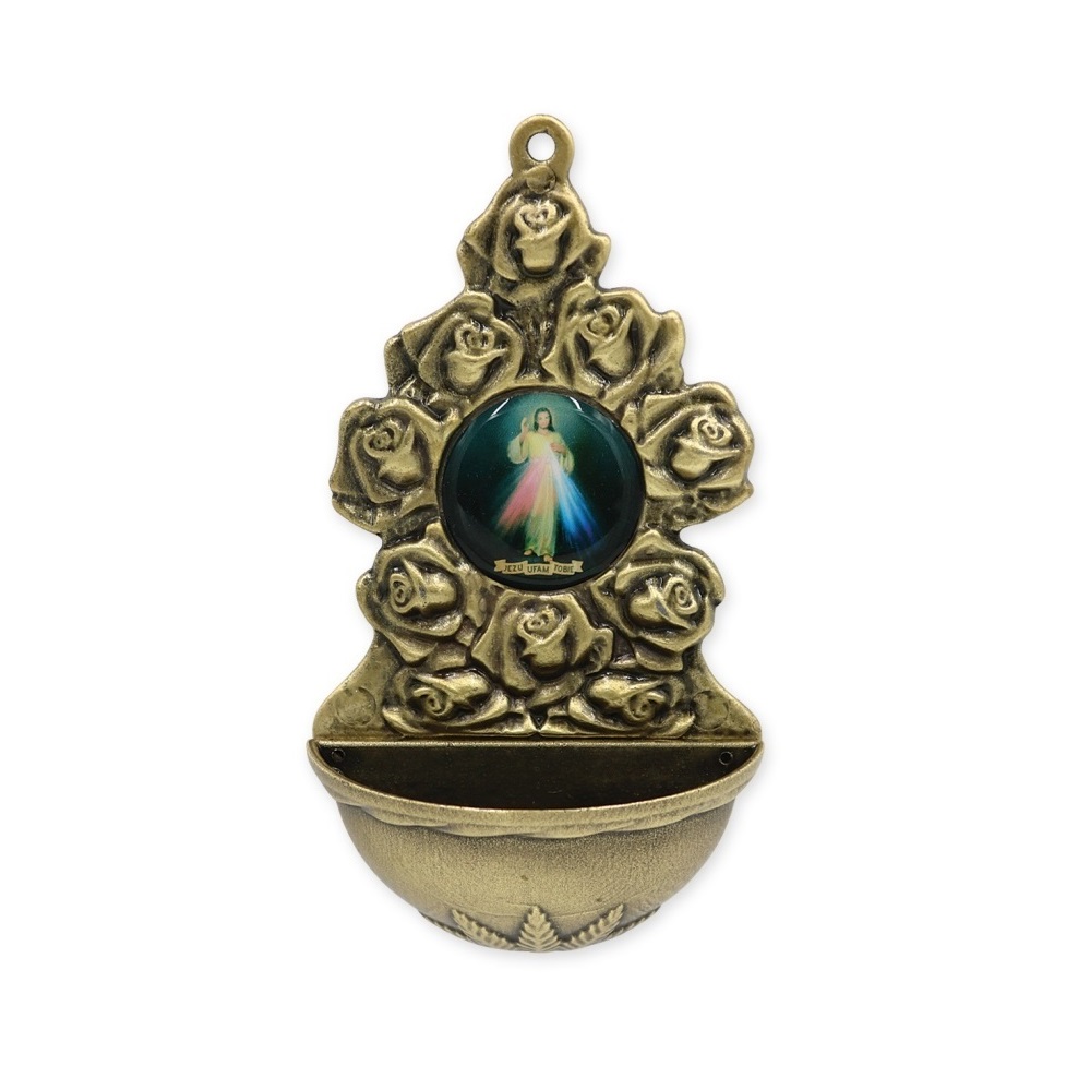 Metalowa kropielniczka z kolorowym wizerunkiem Jezusa Miłosiernego w kolorze starego złota.