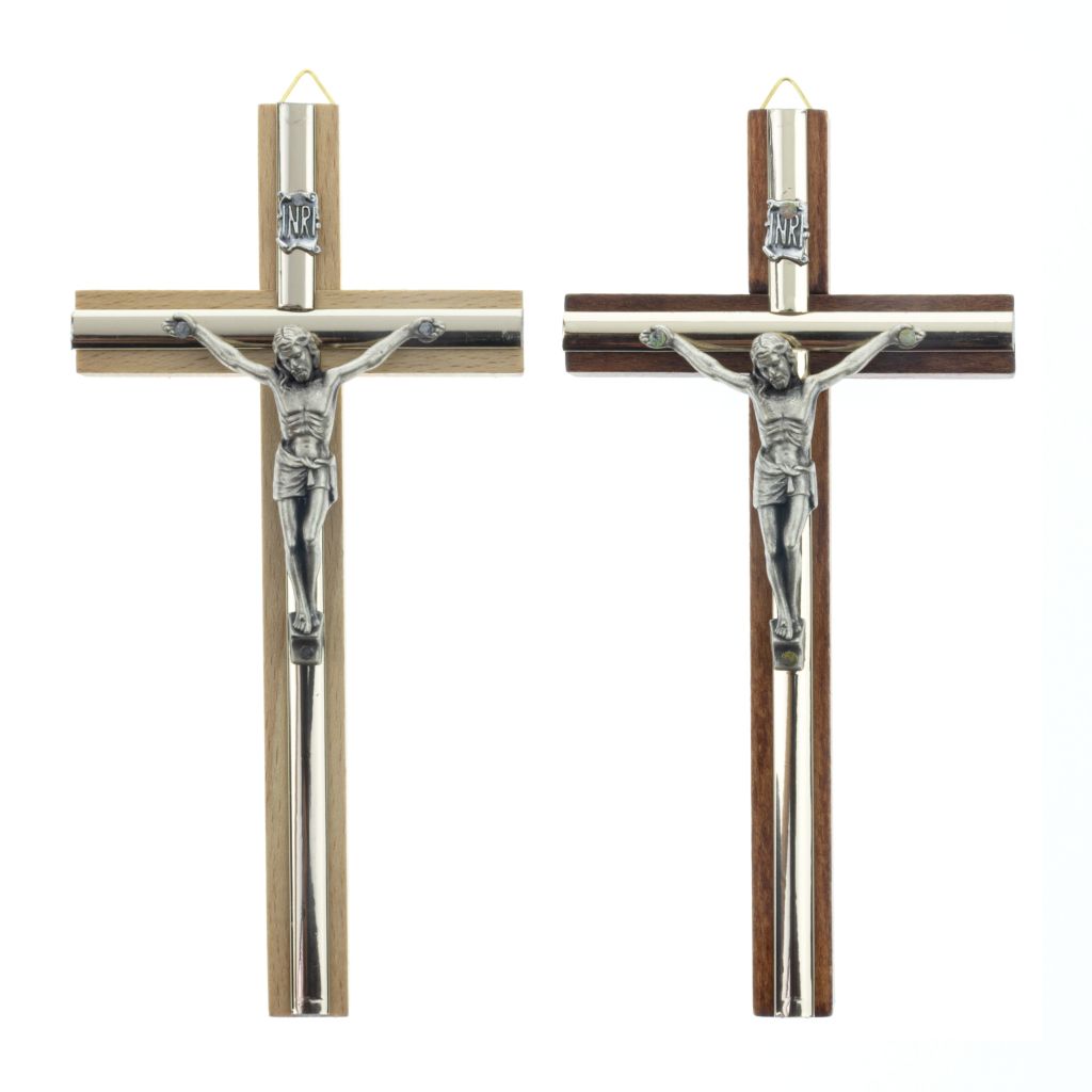 Krzyż drewniany z metalową figurką Jezusa i złotymi zdobieniami. Dostępny w kolorze jasnego i ciemnego brązu.