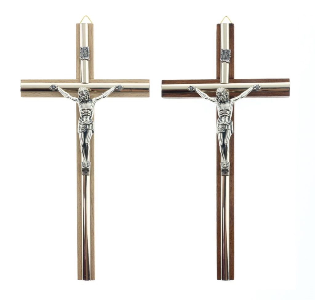 Krzyż drewniany z metalową figurką Jezusa i złotymi zdobieniami. Dostępny w kolorze jasnego i ciemnego brązu.