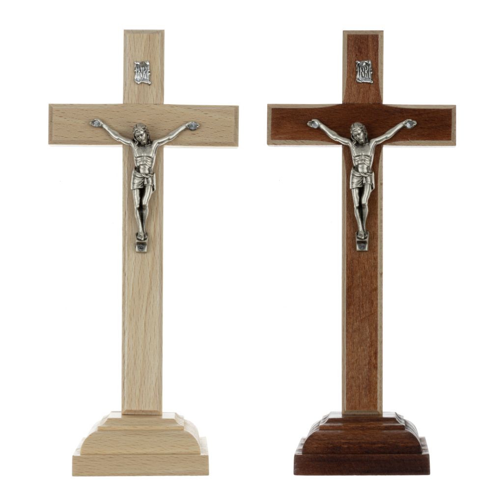 Krzyż drewniany, stojący, frazowany z metalową figurką Jezusa. Dostępny w kolorze jasnego i ciemnego brązu.