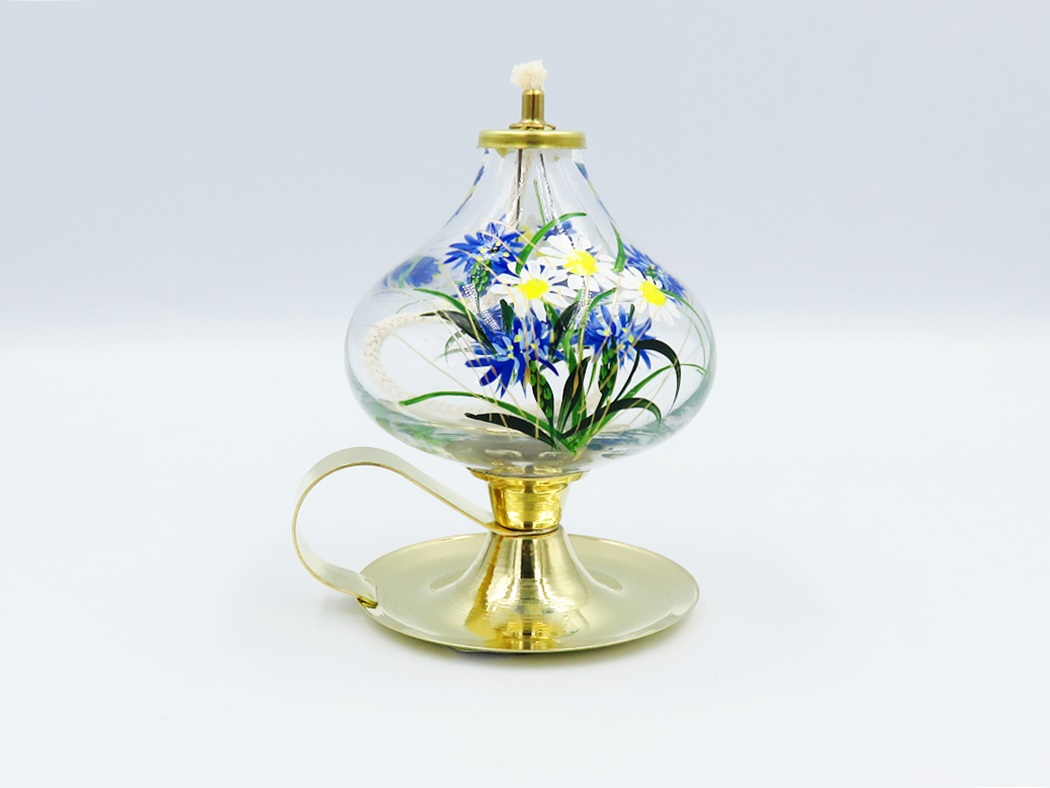 Lampka naftowa ze szklanym kloszem, oprawiona w mosiężną ramę z ręcznie malowanym rumiankiem i chabrem.