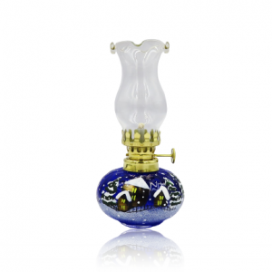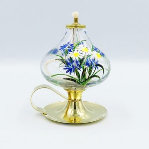 Lampka naftowa ze szklanym kloszem, oprawiona w mosiężną ramę z napisem „Jezu ufam Tobie”.