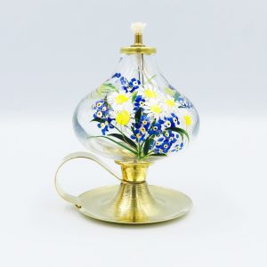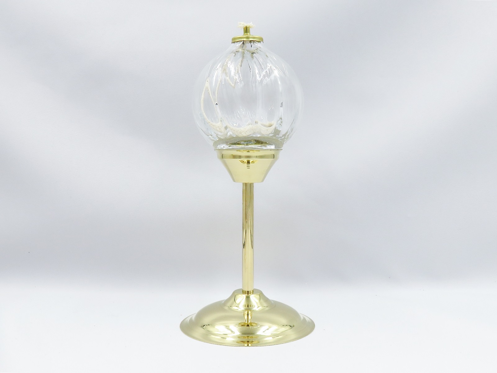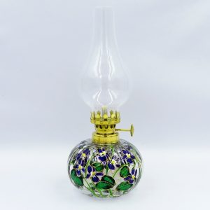 Lampka naftowa ze szklanym kloszem, oprawiona w mosiężną ramę.