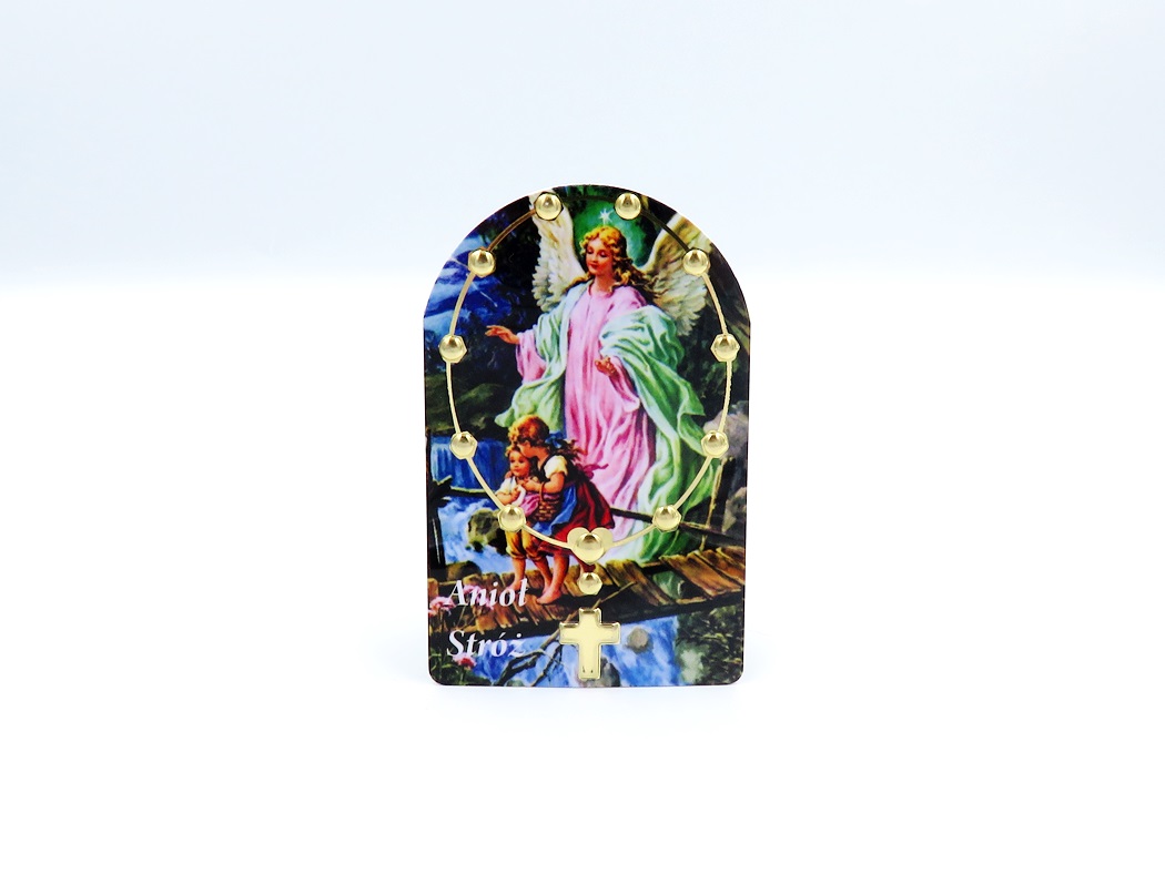 Magnes z dziesiątką różańca ze złotych paciorków imitowanych przez wypukłe wytłoczenia.