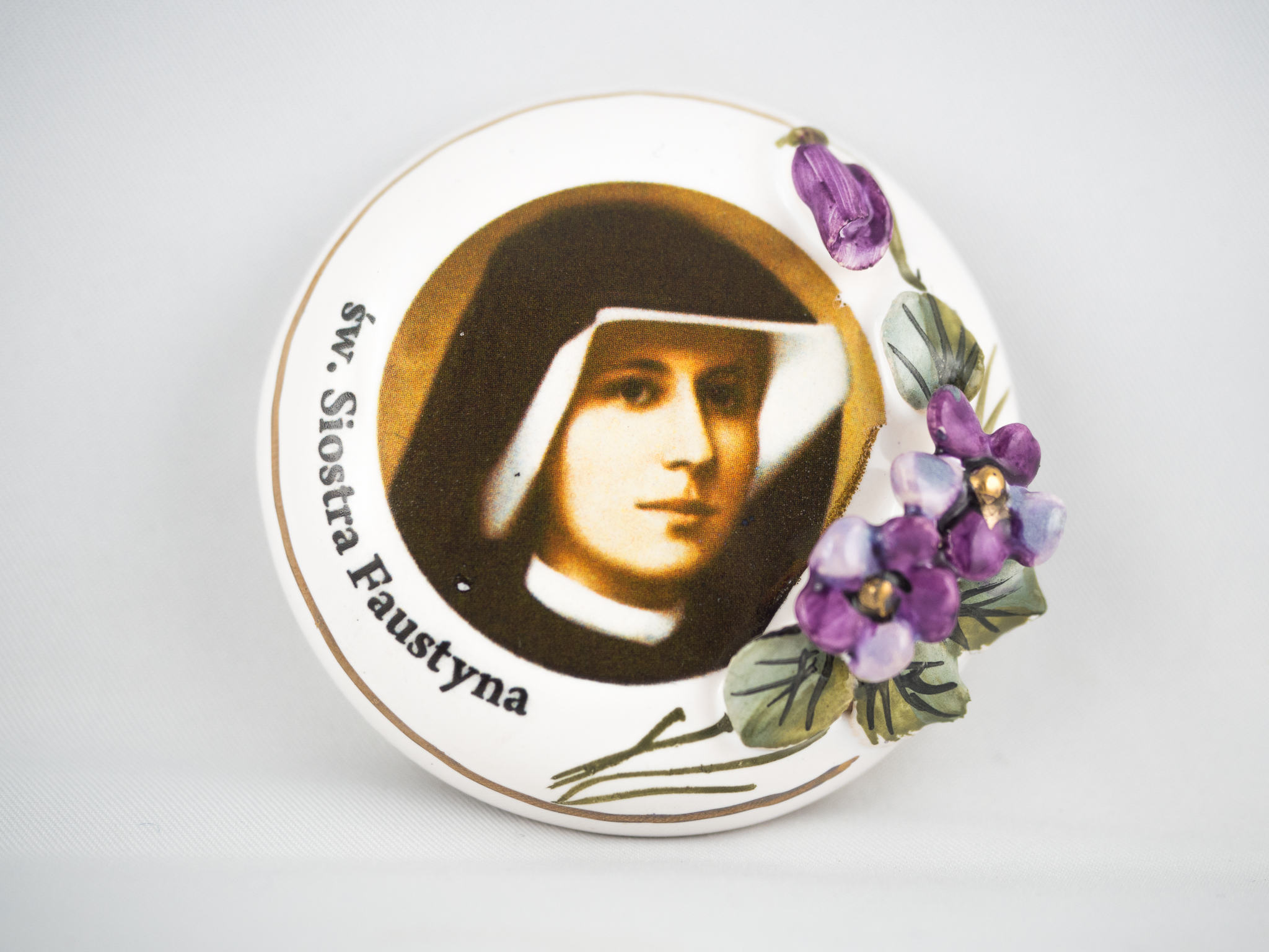 Magnes artystyczny, wykonany z ceramiki, w kształcie koła, z kolorowym nadrukiem wizerunku św. Siostry Faustyny. Fiołek ceramiczny umieszczony na magnesie malowany ręcznie. Oryginalna, wyjątkowa i elegancka jednocześnie pamiątka z Sanktuarium Bożego Miłosierdzia.