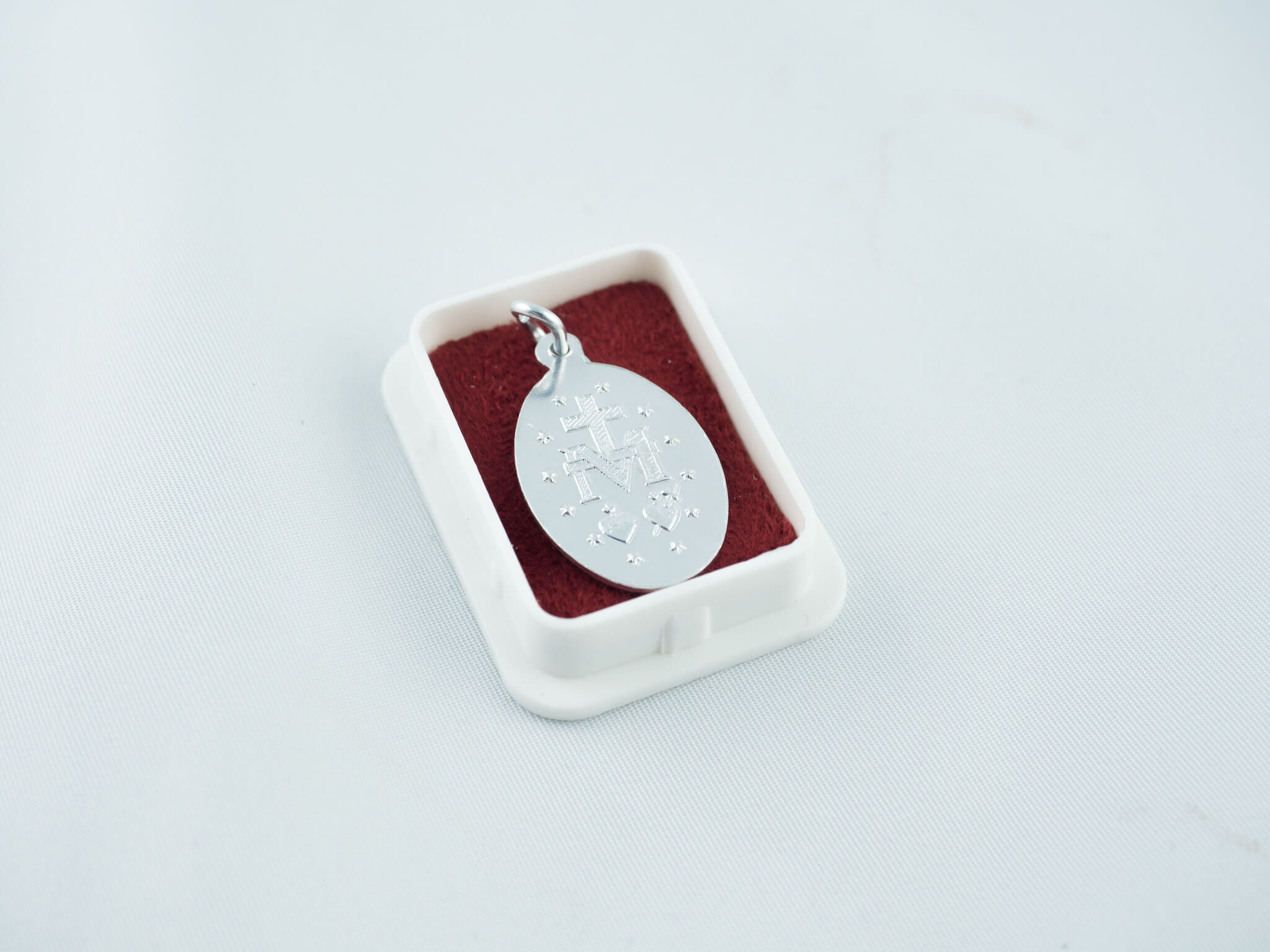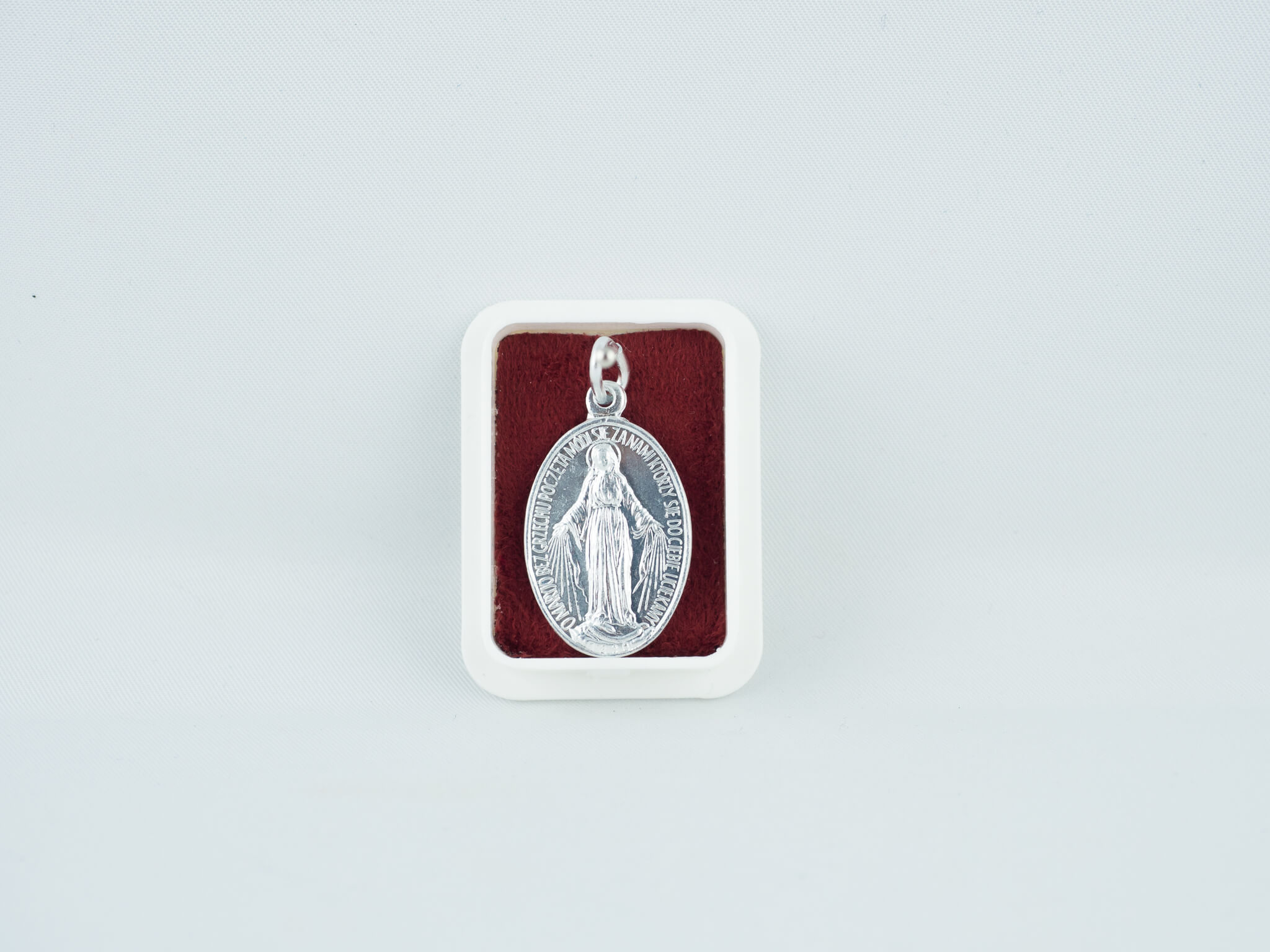 Medalik wykonany z aluminium w kolorze srebrnym, umieszczony w pięknym pudełeczku. Na medaliku przedstawiona została Matka Boska Niepokalana.