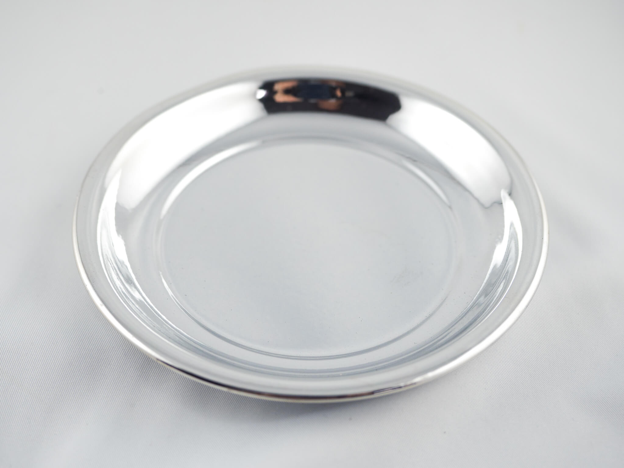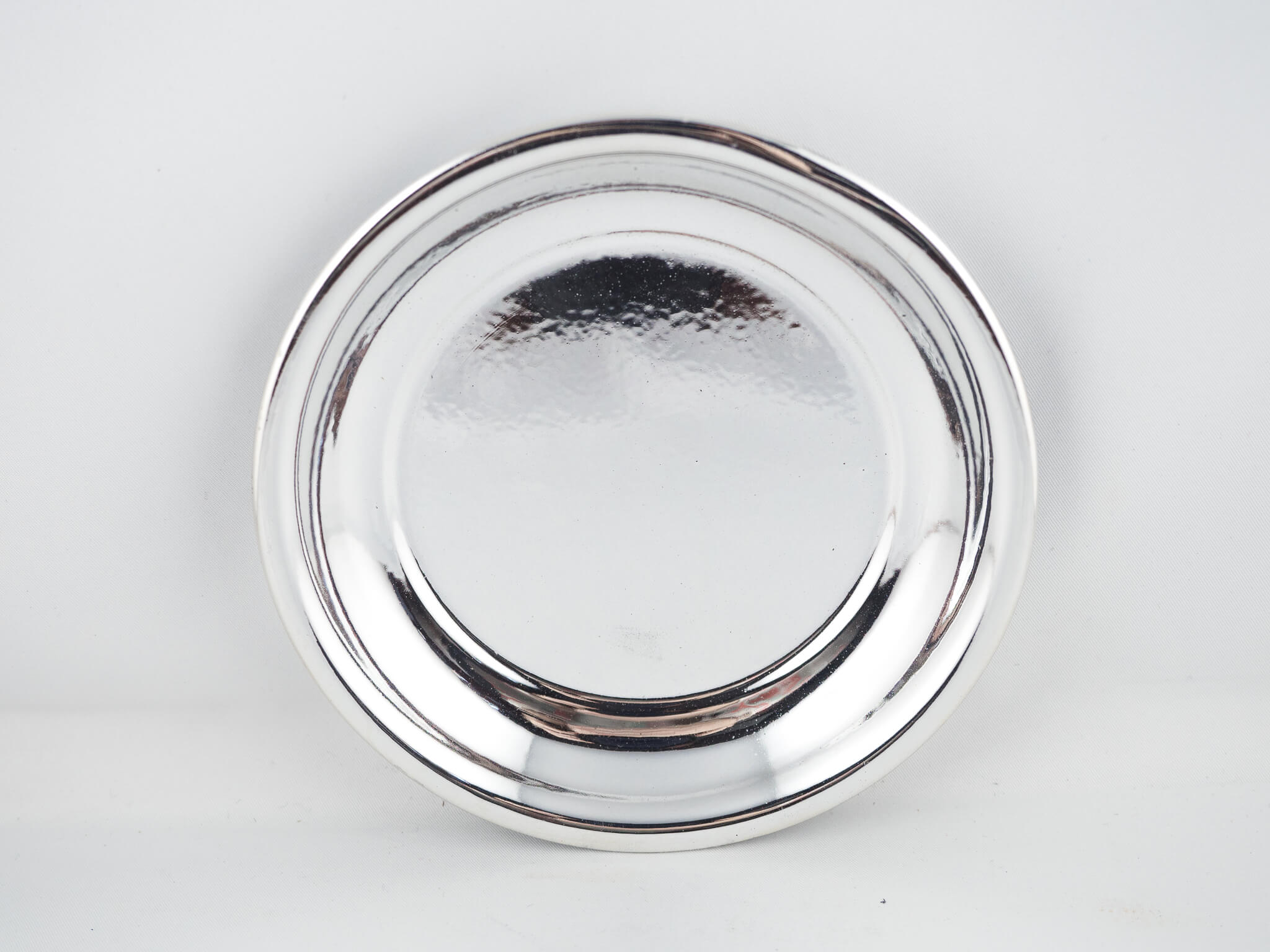Metalowa miseczka na wodę święconą w kolorze srebrnym.