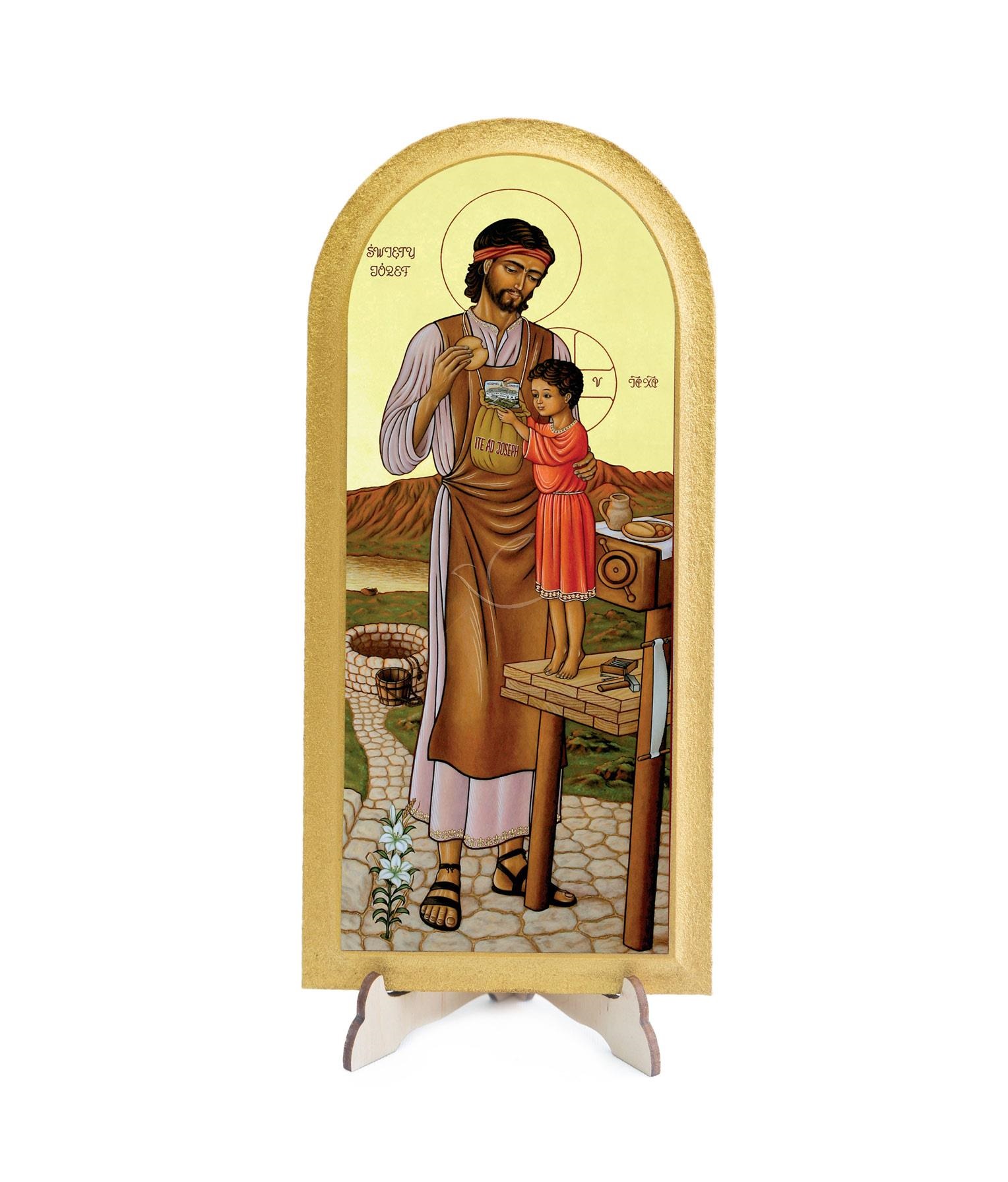 Obraz z wizerunkiem św. Józefa drukowany na tkaninie a następnie naklejony na półokrągłą deskę z płyty HDF.