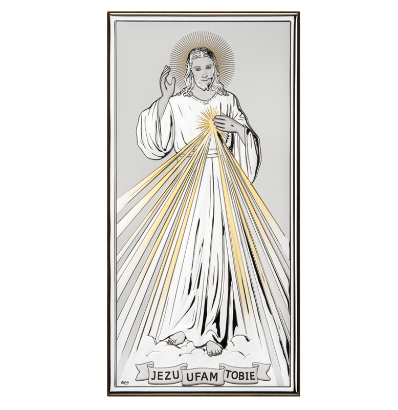 Obrazek srebrny przedstawiający Jezusa Miłosiernego, został wykonany z blachy dwuwarstwowej, aluminium i srebra, osadzony na lakierowanym drewnie.