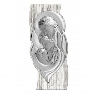 Obrazek srebrny przedstawiający modlącego się chłopca, został wykonany z blachy dwuwarstwowej, aluminium i srebra, osadzony na lakierowanym drewnie.