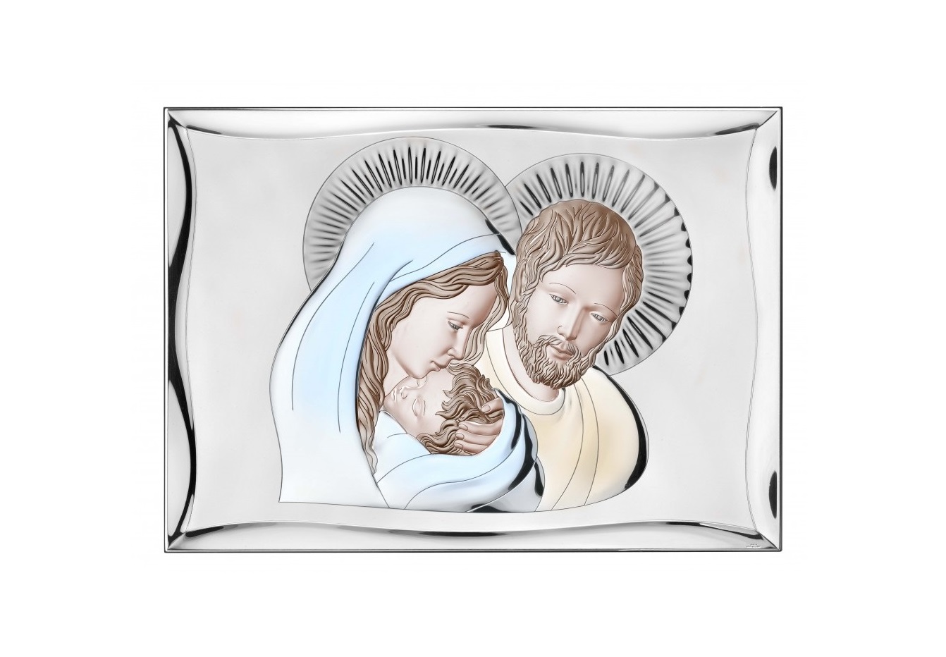 Obrazek srebrny przedstawiający wizerunek Świętej Rodziny, został wykonany z blachy dwuwarstwowej, aluminium i srebra, osadzony na lakierowanym drewnie. Zewnętrzna warstwa srebra pokryta jest zabezpieczającym lakierem, dzięki któremu produkt zachowa swój blask. .
