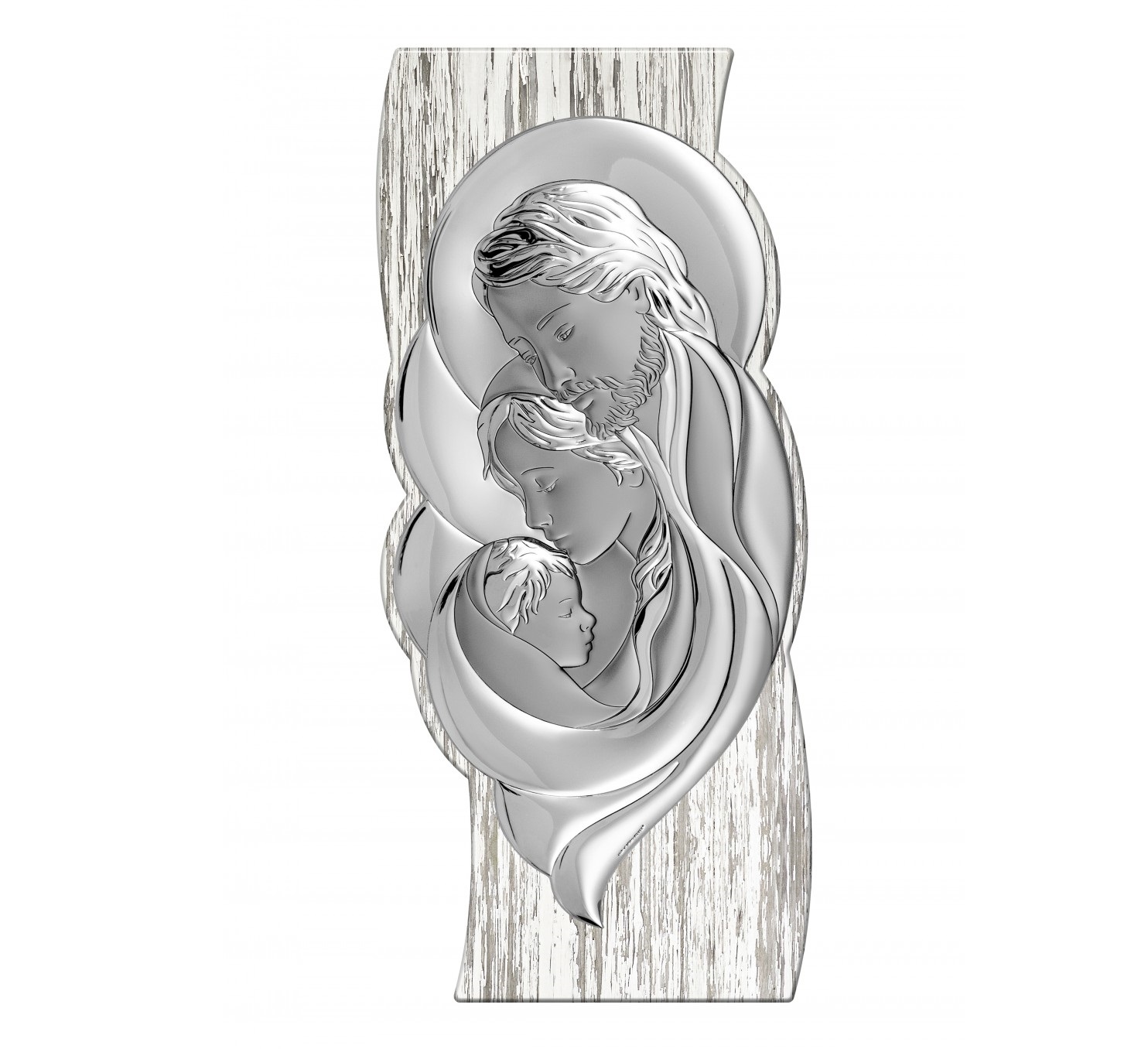 Obrazek srebrny przedstawiający wizerunek Świętej Rodziny, został wykonany z blachy dwuwarstwowej, aluminium i srebra, osadzony na lakierowanym drewnie.