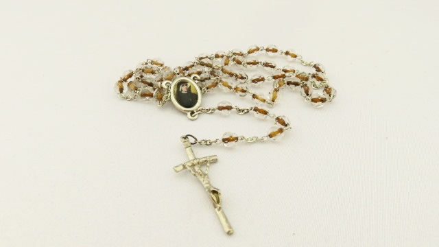 Piękny różaniec z brązowych paciorków połączonych ze sobą medalikiem z kolorowym wizerunkiem św. Siostry Faustyny. Różaniec zakończony jest metalowym krzyżykiem.