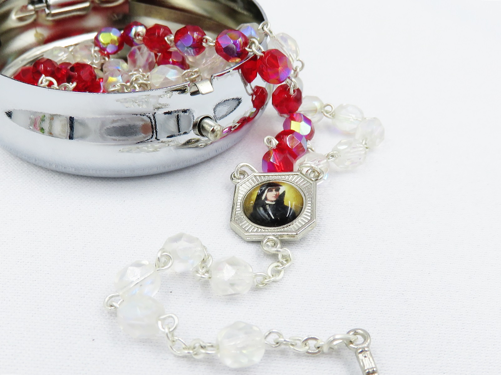 Piękny różaniec z biało-czerwonych paciorków połączonych ze sobą medalikiem z kolorowym wizerunkiem Jezusa Miłosiernego i św. Siostry Faustyny. Różaniec zakończony jest metalowym krzyżykiem.