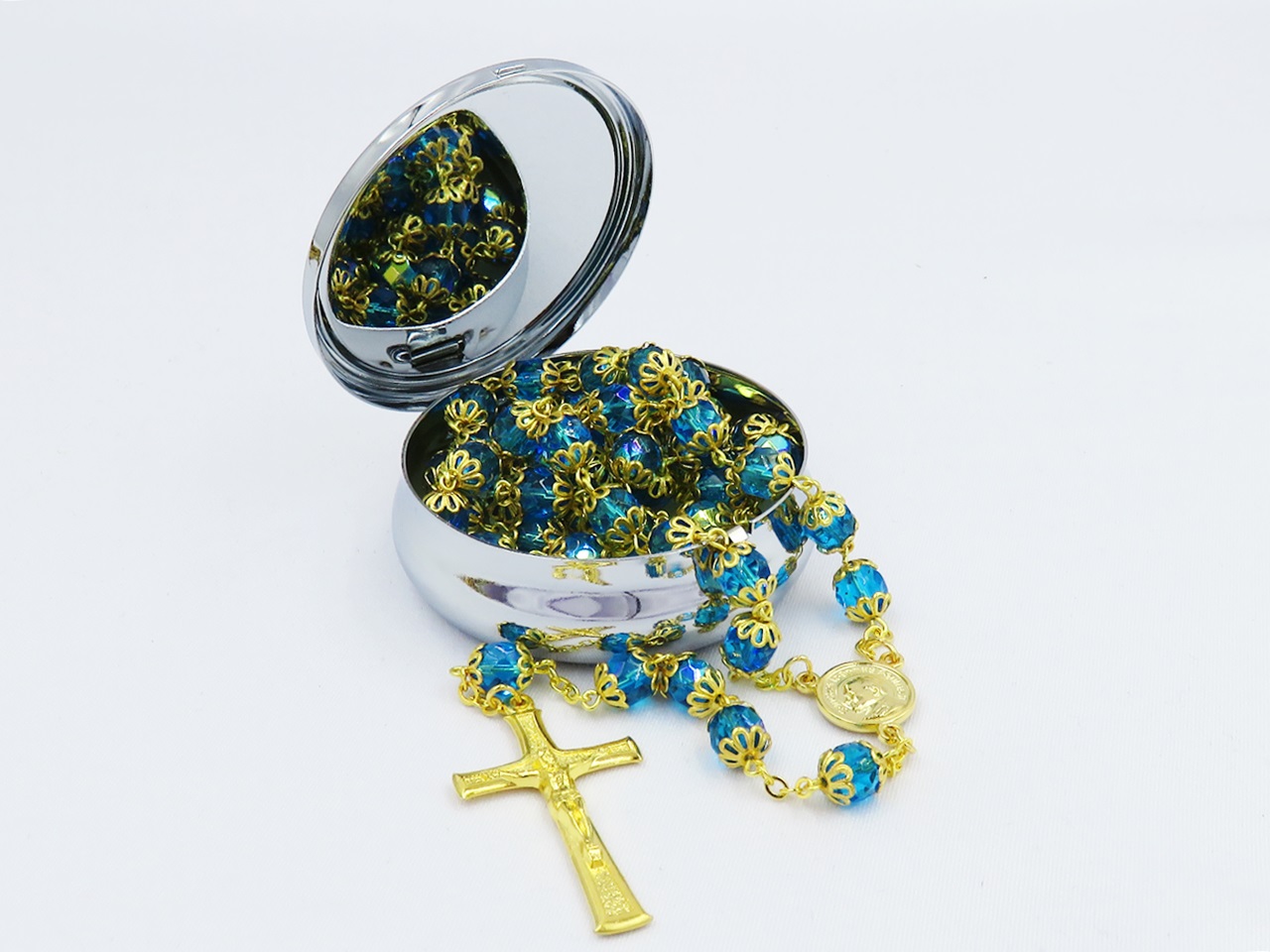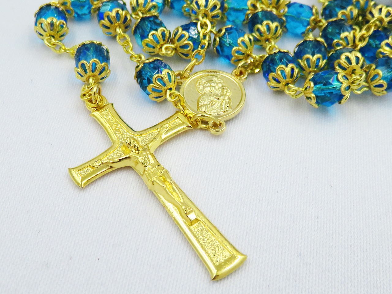 Niezwykły różaniec z paciorków w kolorze błękitu połączonych ze sobą medalikiem z wizerunkiem Jana Pawła II oraz Matki Boskiej Częstochowskiej. Różaniec zakończony jest metalowym krzyżykiem.
