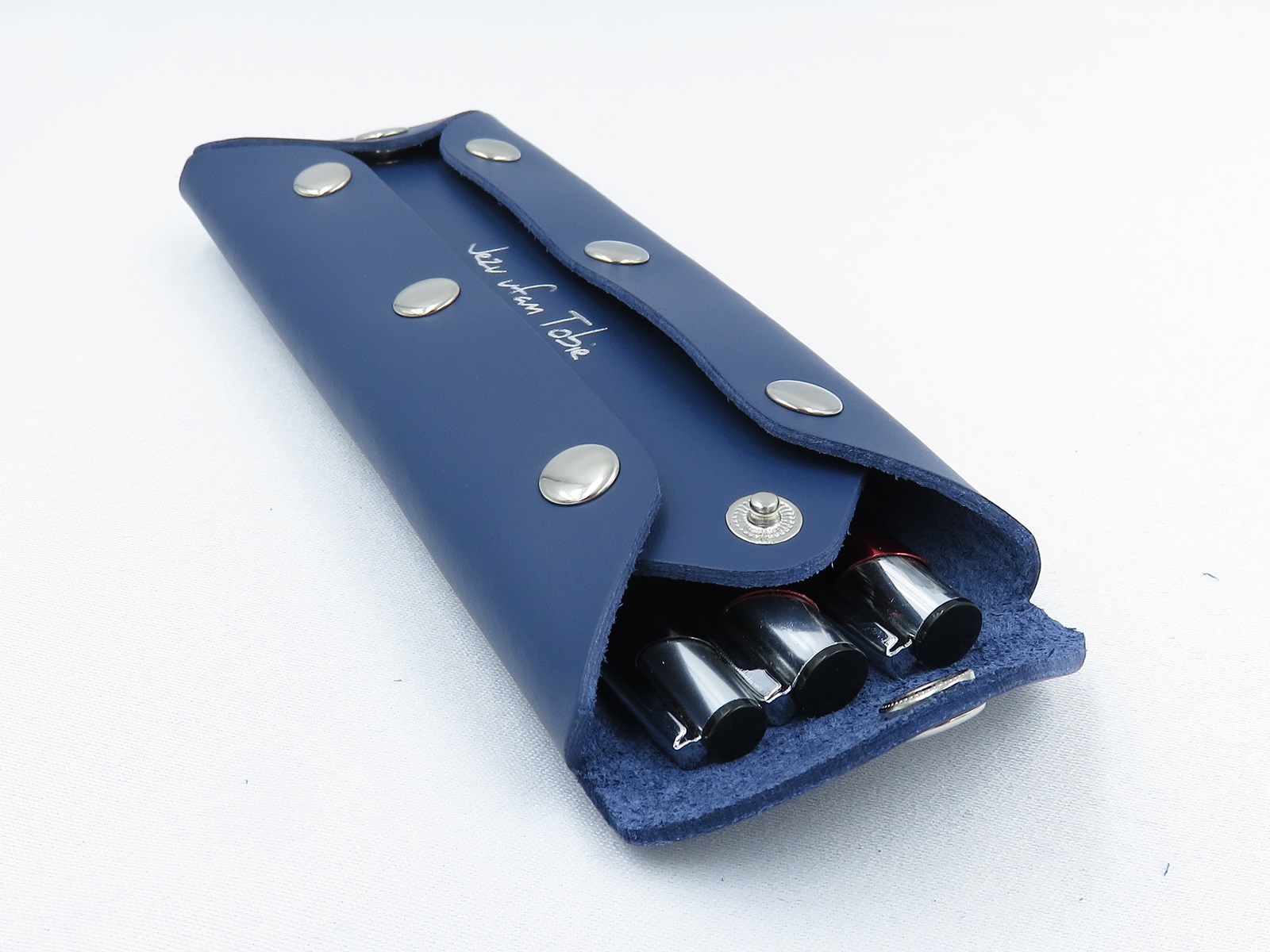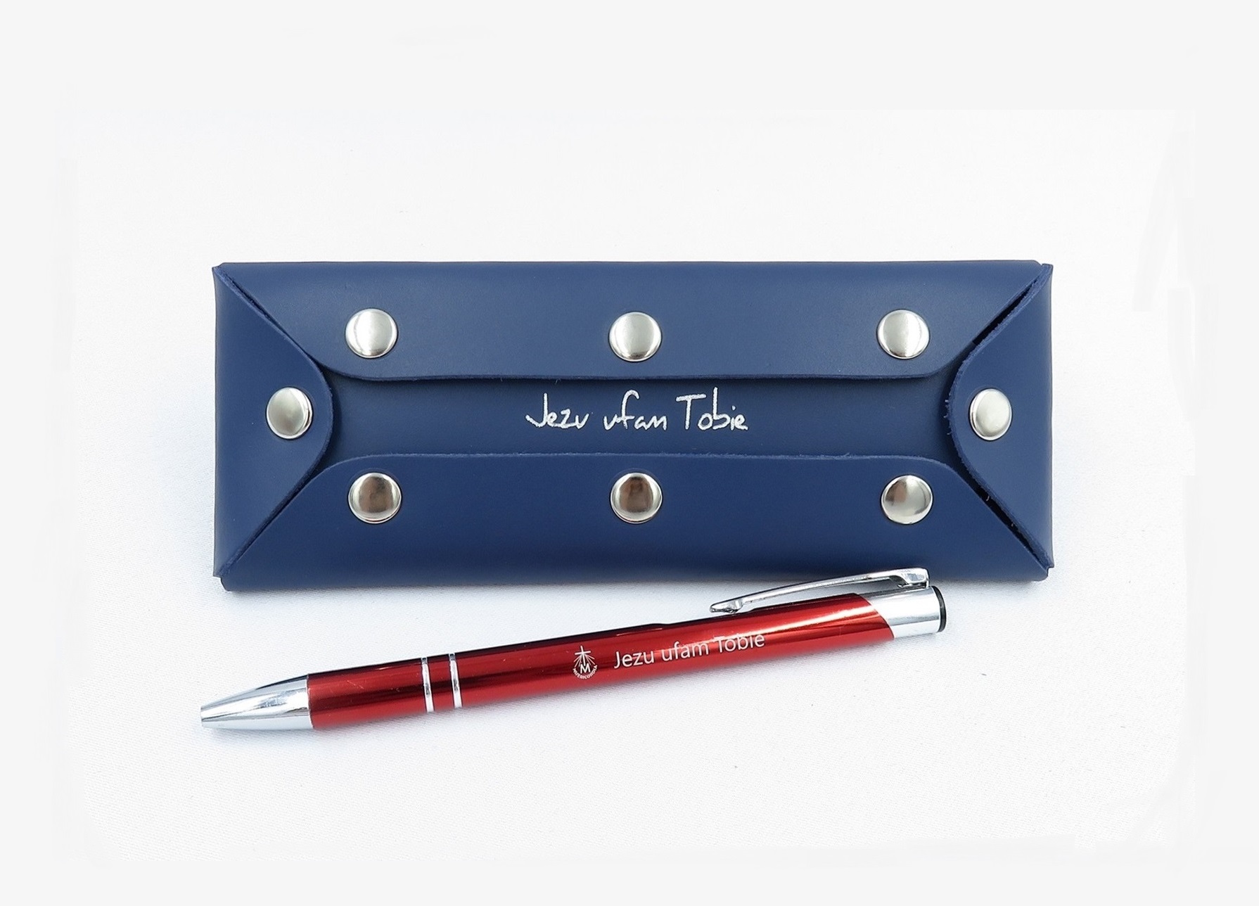 Granatowe, skórzane etui na długopisy z napisem „Jezu ufam Tobie”, zapinane na metalowe zatrzaski .