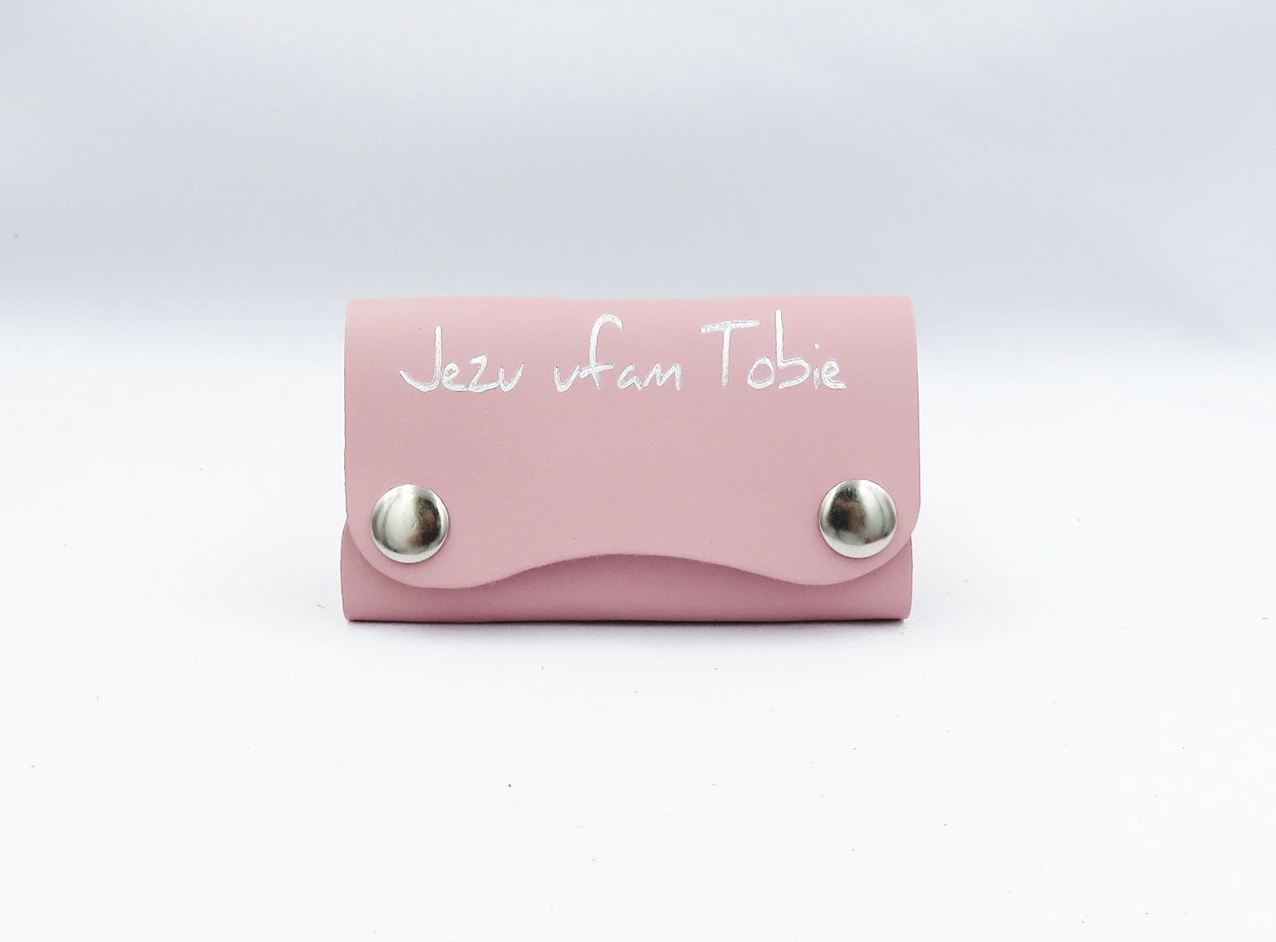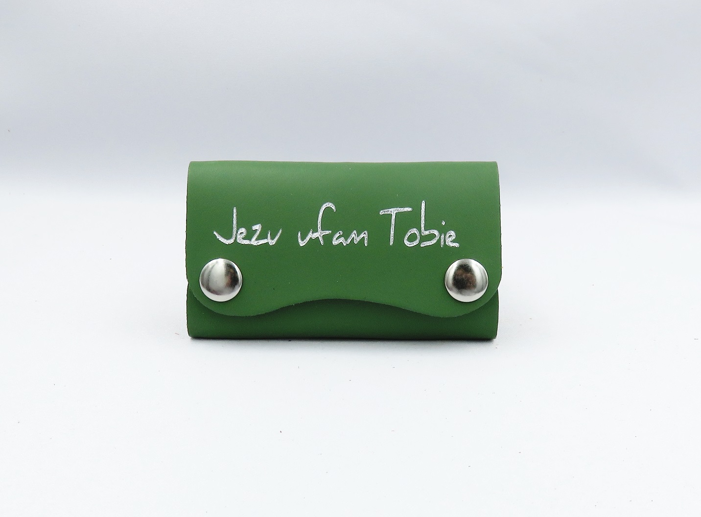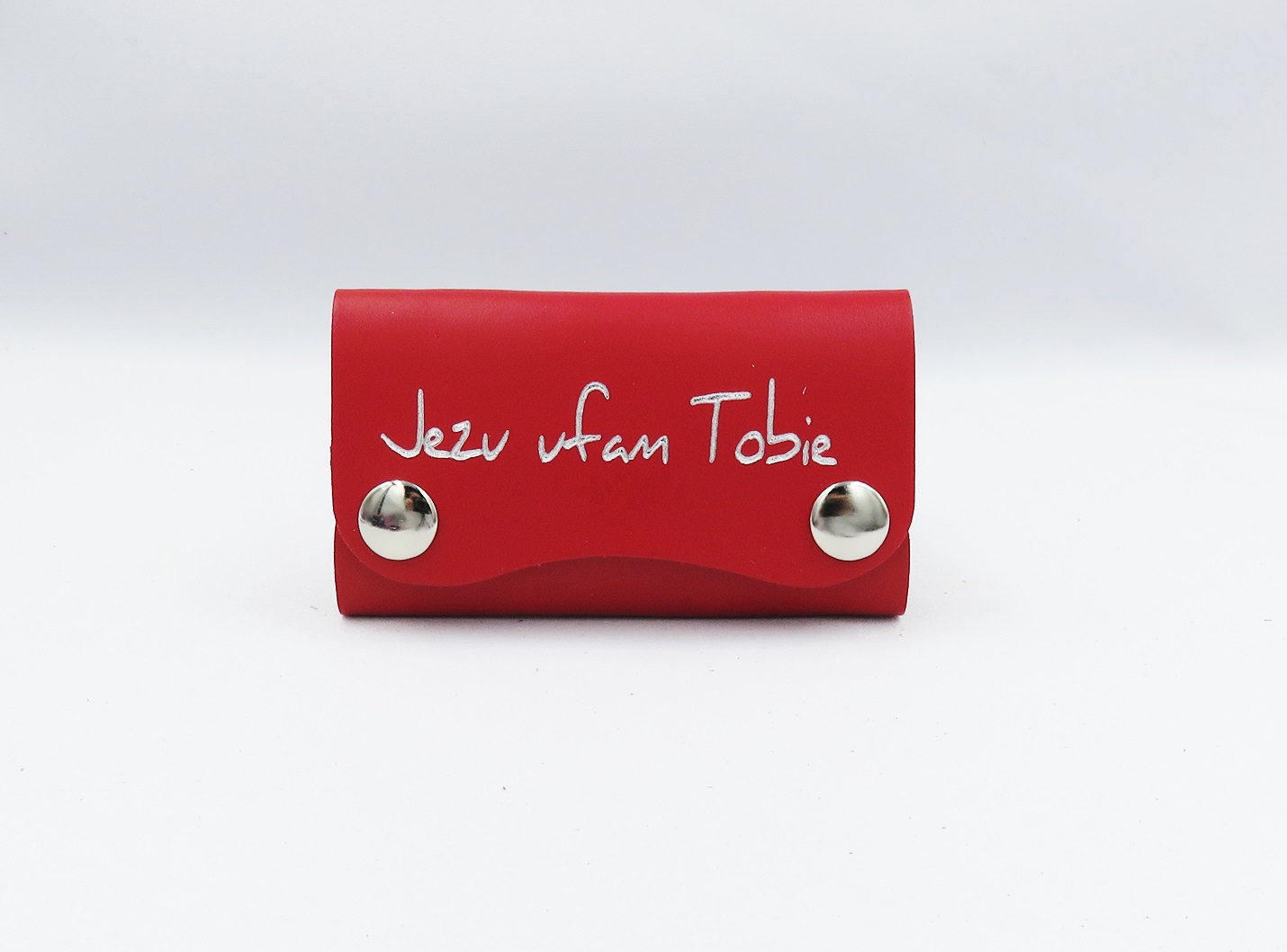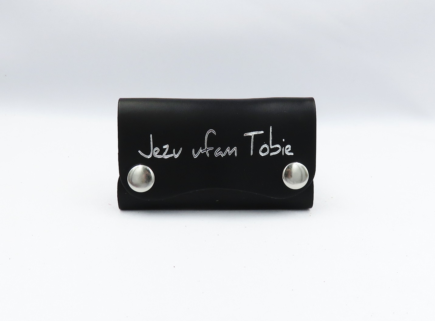 Skórzane etui na klucze z napisem „Jezu ufam Tobie”, zapinane na metalowe zatrzaski.