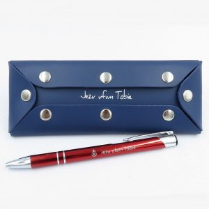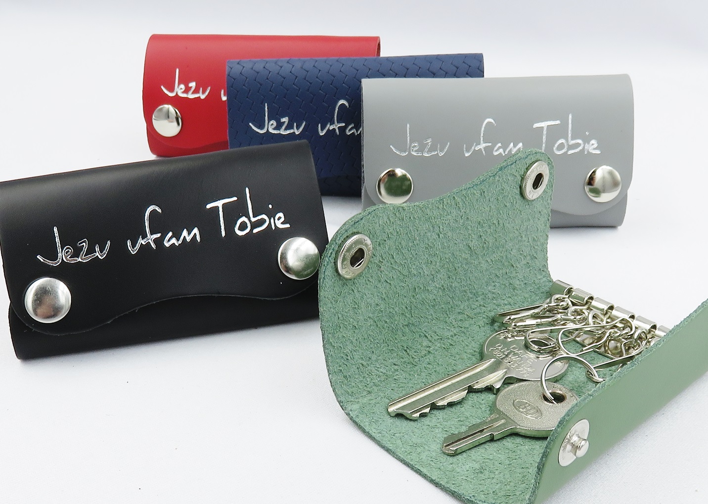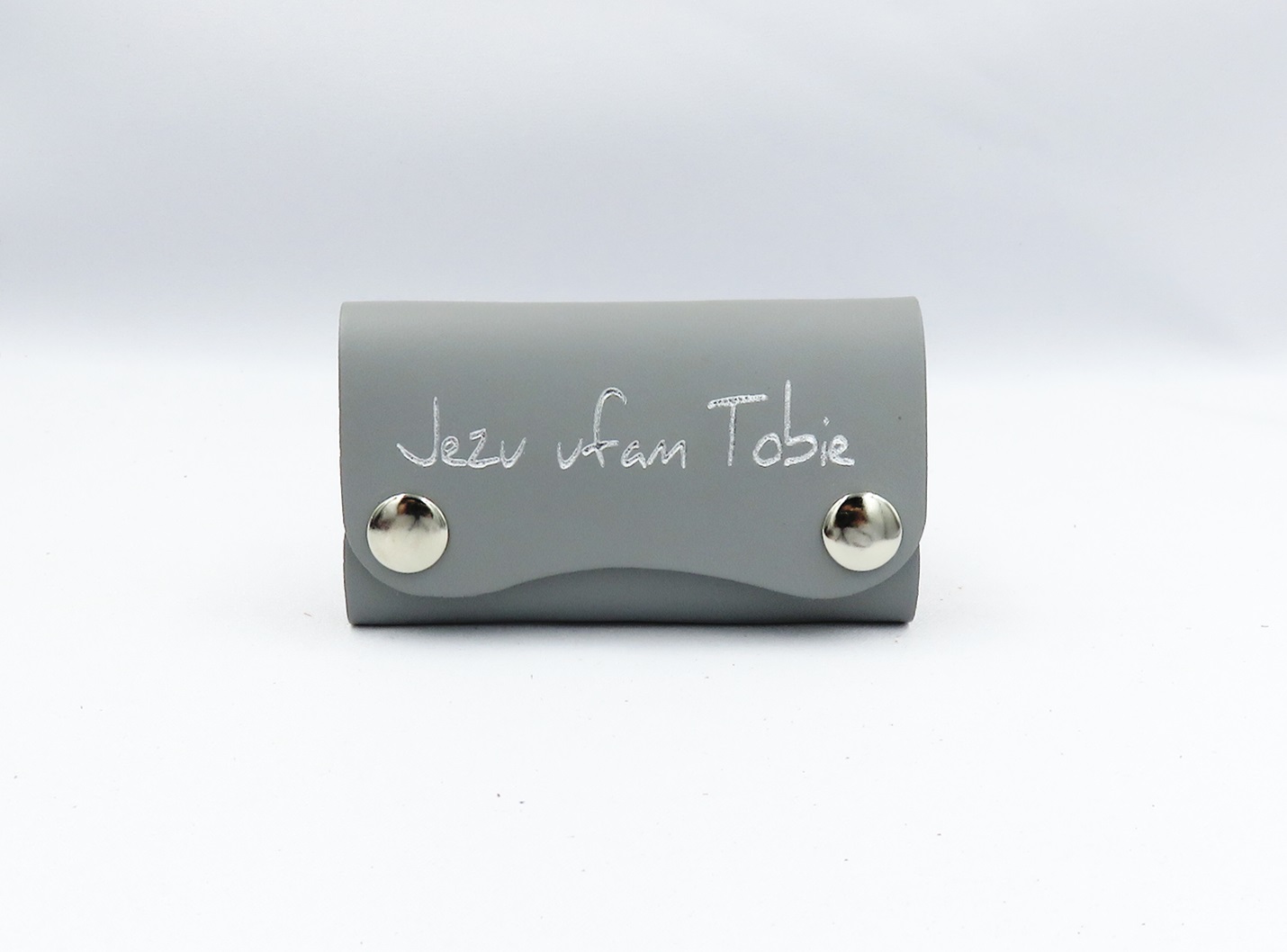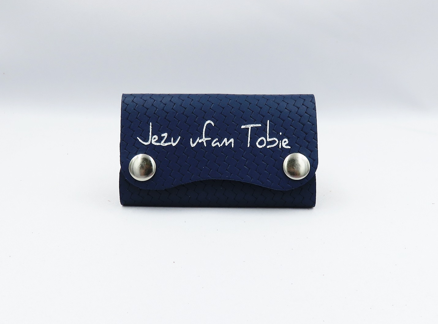 Skórzane etui na klucze z napisem „Jezu ufam Tobie”, zapinane na metalowe zatrzaski.