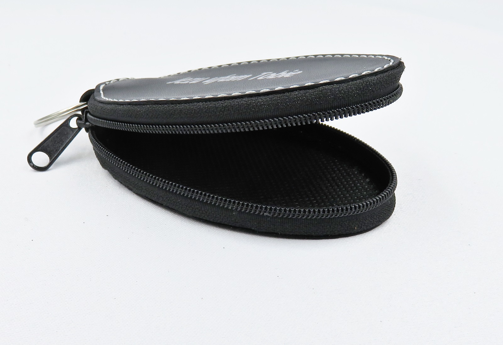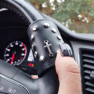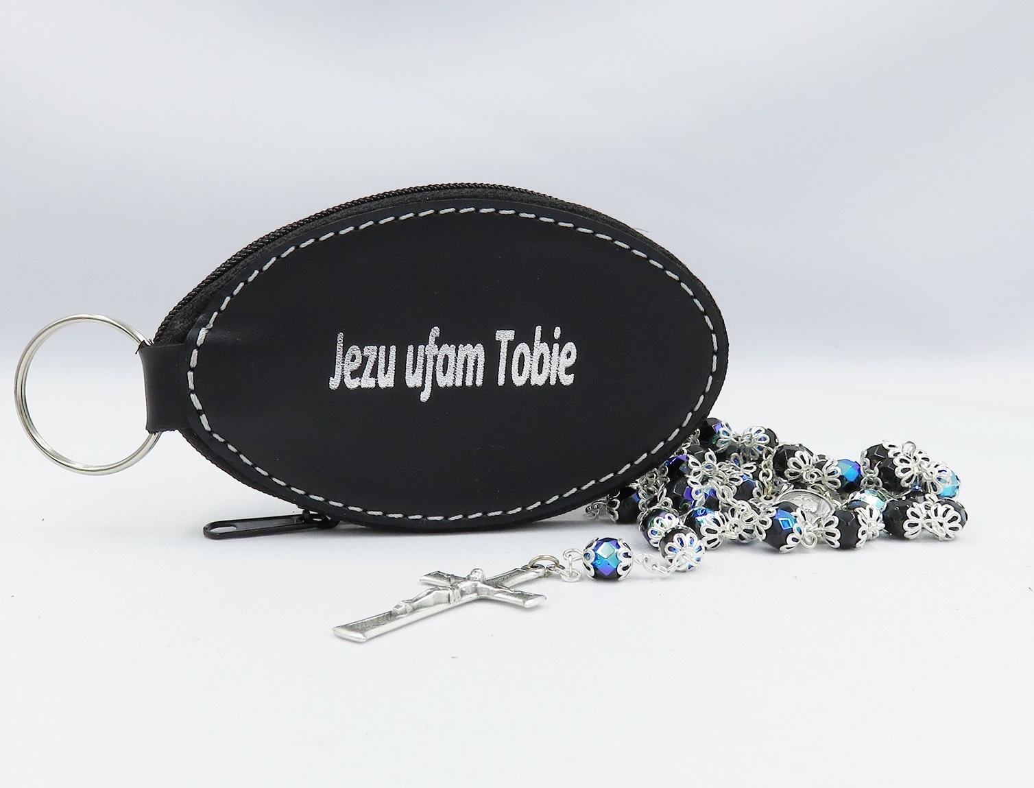 Czarne, skórzane etui na różaniec z napisem „Jezu ufam Tobie”, zapinane na zamek