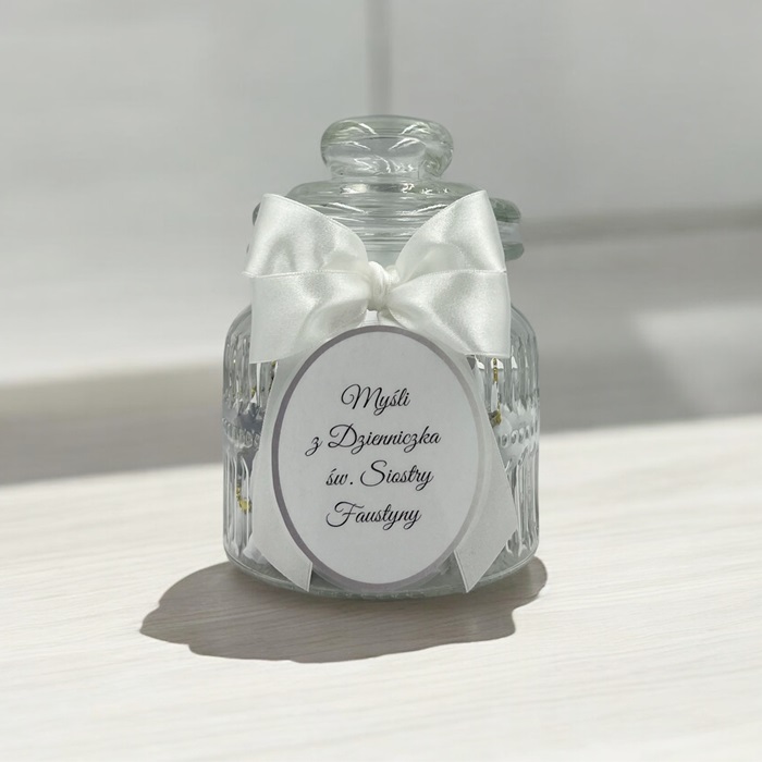 Słoiczek z myślami z Dzienniczka św. Siostry Faustyny to wyjątkowy upominek na każdą okazję. Ręcznie wykonany. Każda myśl przyozdobiona wstążką. Słoiczek zawiera 50 myśli z Dzienniczka św. Faustyny, które mogą się stać słowem pocieszenia, wsparcia czy poznania głębiej Bożego Miłosierdzia.